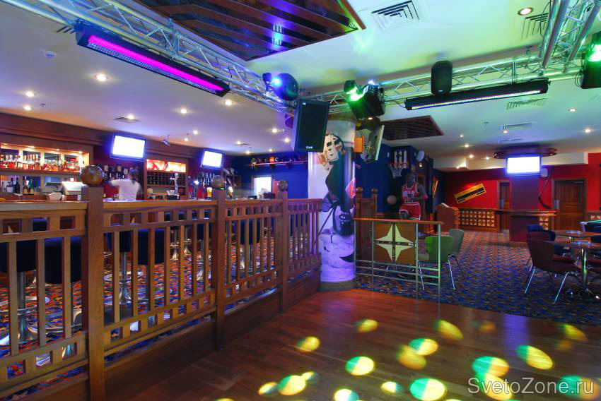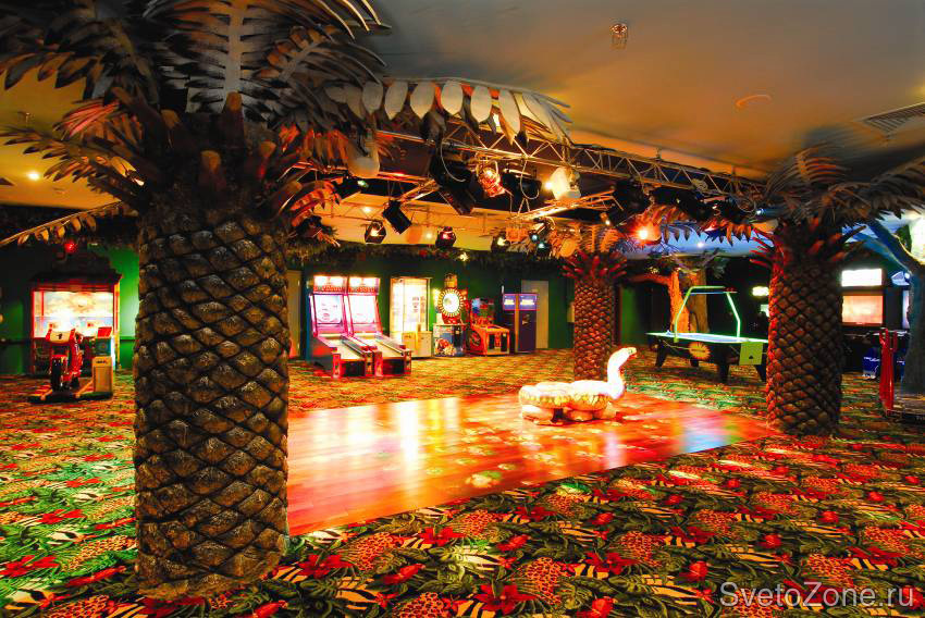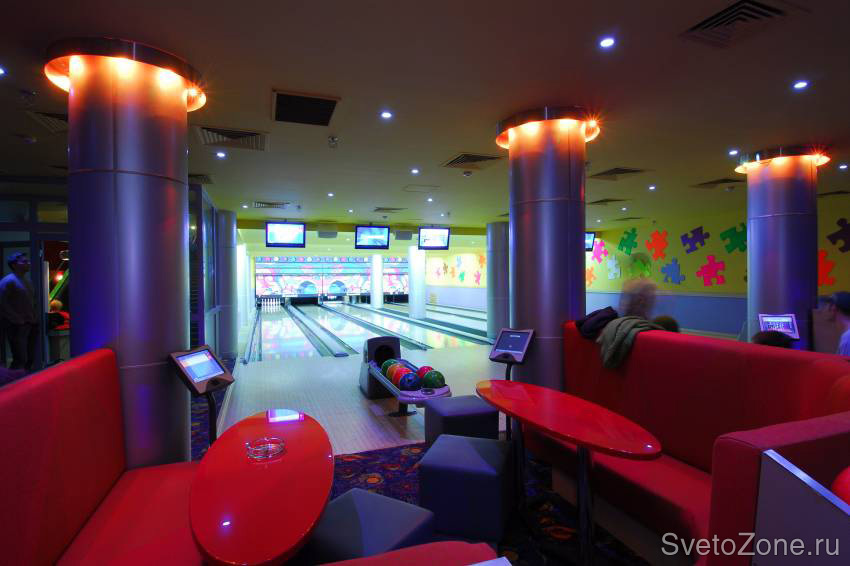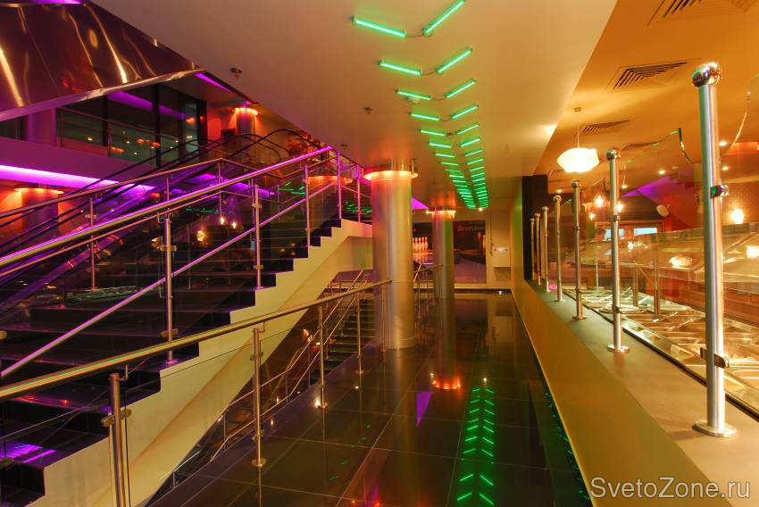 Главная особенность светотехнического проекта - это, прежде всего, широкое применение светодиодов для декоративного и частично для общего освещения. Светодиодные RGB-светильники установлены вдоль плинтусов для декоративной подсветки пола в «Космик-боулинге», зонах входа и перед гардеробом, подсвечивая колонны в общих зонах. А лестничные пролеты освещают светодиодные приборы белого света. В результате общее энергопотребление в «Джигсо» значительно ниже, чем в развлекательных комплексах аналогичных размеров, где используются в основном галогенные и люминесцентные лампы.