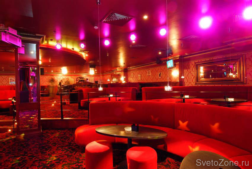 Центральную часть зала украшает большая люстра с хрустальными подвесками, по периметру которой расположены линейки светодиодов от LDI (Италия), создающие переливающийся цветной ореол на потолке. В дополнение к светодиодным приборам над каждым столиком закреплен изящный точечный светильник Sirius с галогенной лампой.