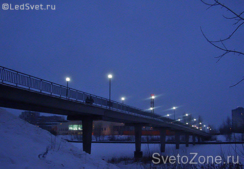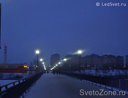Для освещения садово-парковых зон, пешеходов, дорожек, площадей разработана специальная серия светодиодных светильников ПСС ШАР. Прибор выполнен в классическом корпусе со стандартным способом крепления на столбы. В данном проекте (г. Нижний Новгород, пешеходный мост через Мещерское озеро) эффективно заменили существующее освещение, где использовались лампы типа ДРЛ (125 Вт) и ДнаТ (70 Вт), когда энергопотребление светодиодного светильника составляет всего 30 Вт.