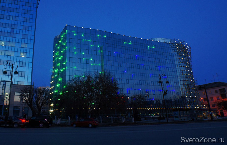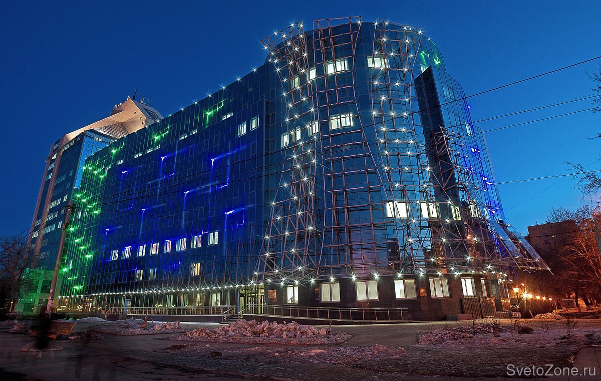Все здание имеет современный облик, имеющий отношение к новым технологиям, поэтому стиль и метод освещения фасада был выбран не случайно. Основное поле остекления освещено Г-образными узкими светодиодными светильниками двух цветов – синий и зеленый. Их цель – создать мерцающий эффект, блики на подобии бликов от воды. Центральный элемент из стеклянных лепестков равномерно покрыт светодиодными точечными модулями, которые дают определенную динамику изменения свечения. Не смотря на криволинейные элементы, каркас здания весьма ортогонален и мы усилили этот эффект размещением светодиодных модулей на верхнем этаже и подсветкой первого уровня встроенными светильниками. |