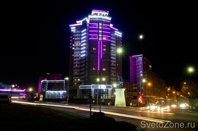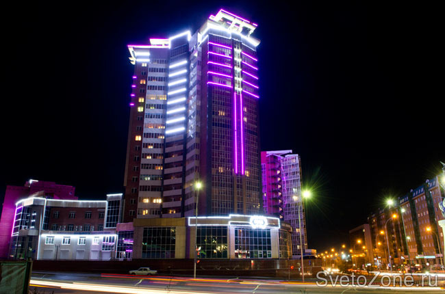 Декоративное освещение жилого дома подчеркивает основные архитектурные элементы здания, отсутствует паразитная засветка в окна жильцов дома. |