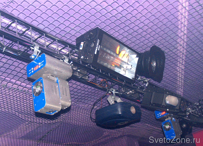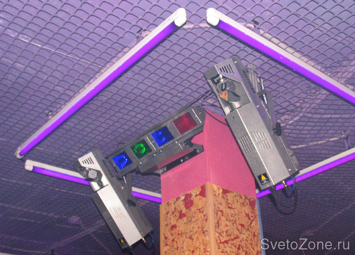 Интерьерная особенность помещения заключалась в невозможности подвески светового оборудования на потолке, поэтому были разработаны специальные конструкционные модули, позволившие провести инсталляцию практически всего светового оборудования и световых эффектов на колоннах. Интересным решением явилось расположение линейных ультрафиолетовых светильников вокруг колонн под потолком. Только несколько световых приборов: Миражи и прожекторы PAR 56 , занятые на освещении сцены, размещены на двух фермах квадратного сечения.