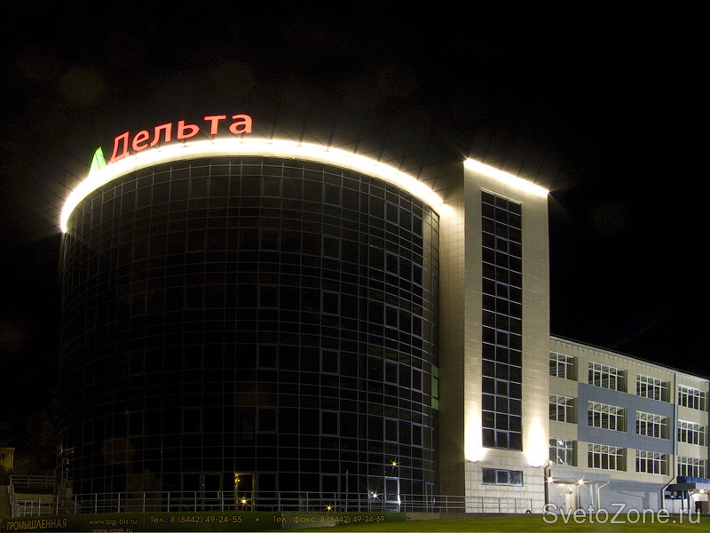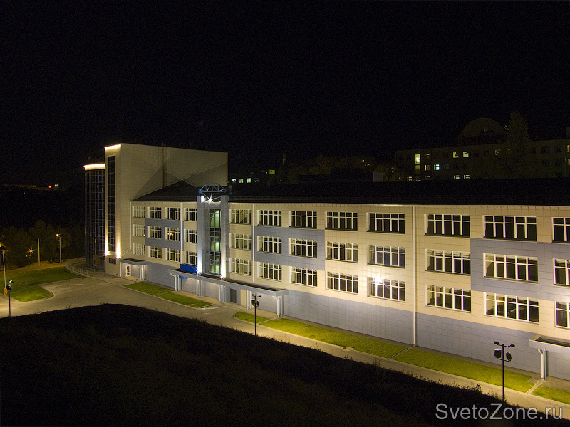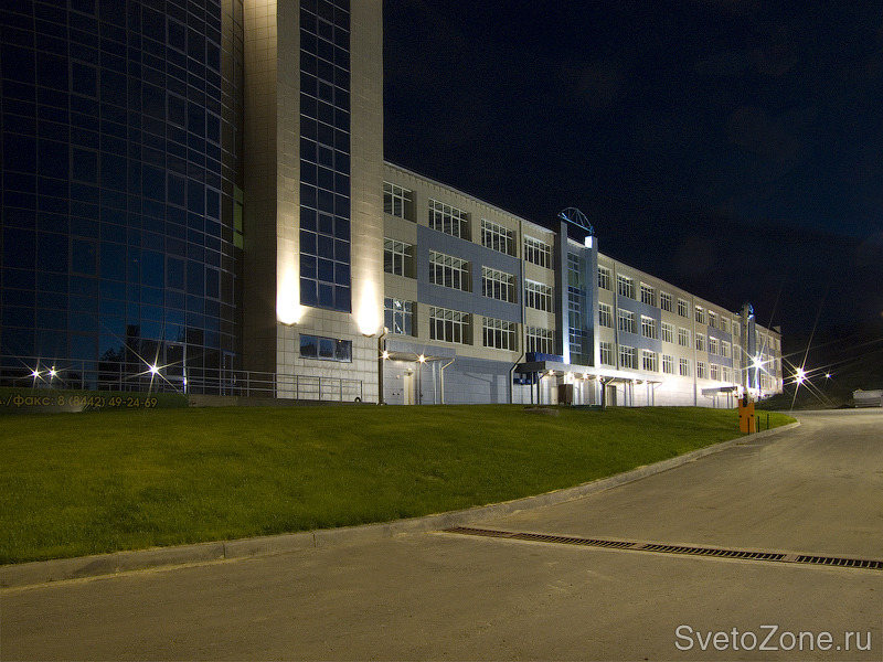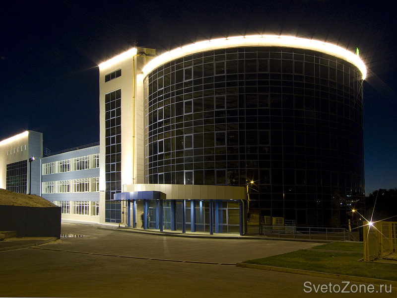 Для освещения подъездных путей и парковок комплекса были спроектированы и использованы нестандартные опоры с установкой прожекторов "Смайл" на специальных кронштейнах. На этих же опорах располагаются прожекторы "Эволюшн" для общего освещения фасада. Для акцентного и декоративного освещения на фасаде применены прожекторы "Стайл" и линейные светильники "Лайн". Все оборудование производства компании "Сарос" (Россия). Система освещения управляется щитовой продукцией Theben (Германия). |