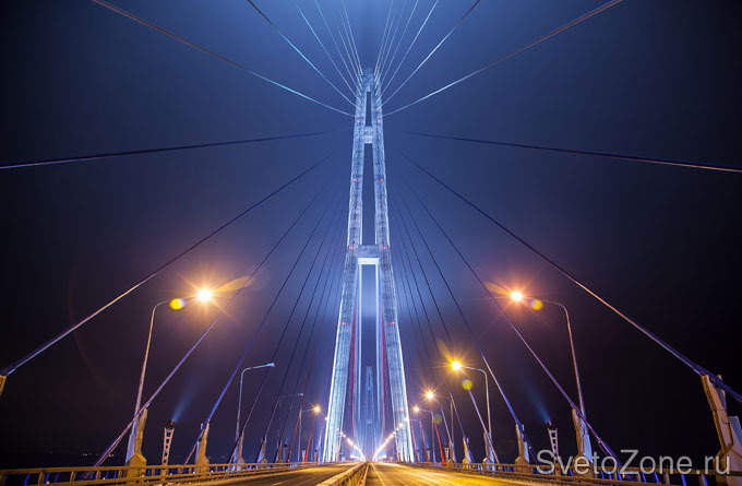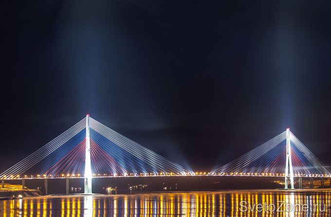 Используемое оборудование: Для линейной подсветки основного пролетного строения были выбраны светодиодные светильники специализированной серии IntiLINE marine производства "IntiLED". Усиленное климатическое исполнение топового изделия модельного ряда "IntiLED" отличается высокой степенью защиты от внешних воздействий (IP 67), повышенной виброустойчивостью и влагозащищенностью. Более 200 морских линеек "IntiLED" мощностью 100 Вт органично вписаны в структуру моста, создавая неповторимый ночной вид и не нарушая при этом дневную эстетику сооружения. Осветительное оборудование закреплено таким образом, чтобы не создавать дополнительных трудностей при эксплуатации конструкций моста, благодаря специально разработанным под проект двойным кронштейнам.