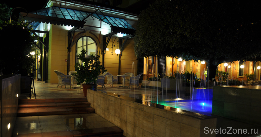 Освещение рекреационной зоны, бассейна и сада в гостинице Гран Палас Отель, г. Монтекатини Терме