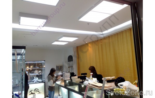 Светодиодные накладные светильники ДПО01-35-001 были смонтированы в ювелирном салоне. Ранее использовались обычные светильники с люминесцентными лампами, которые потребляли не менее 96 Вт. После установки led светильников производства завода "БаррусГрупп" освещенность в салоне значительно улучшилась, пульсации снизились, работоспособность персонала увеличилась.