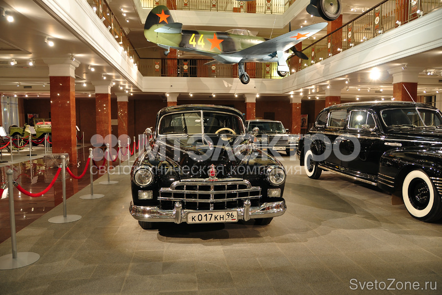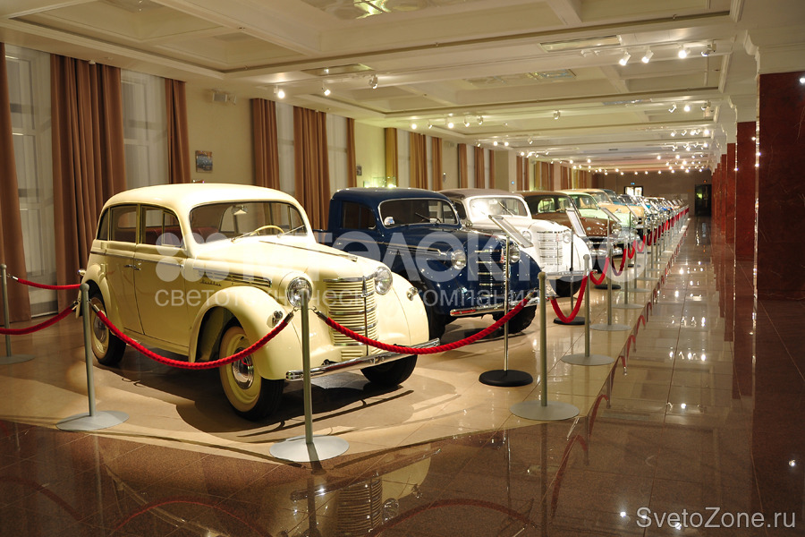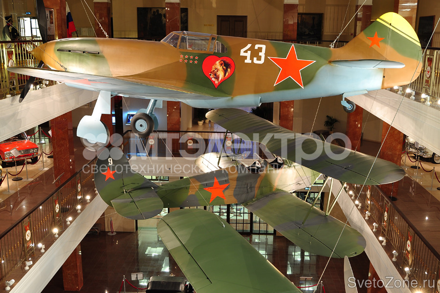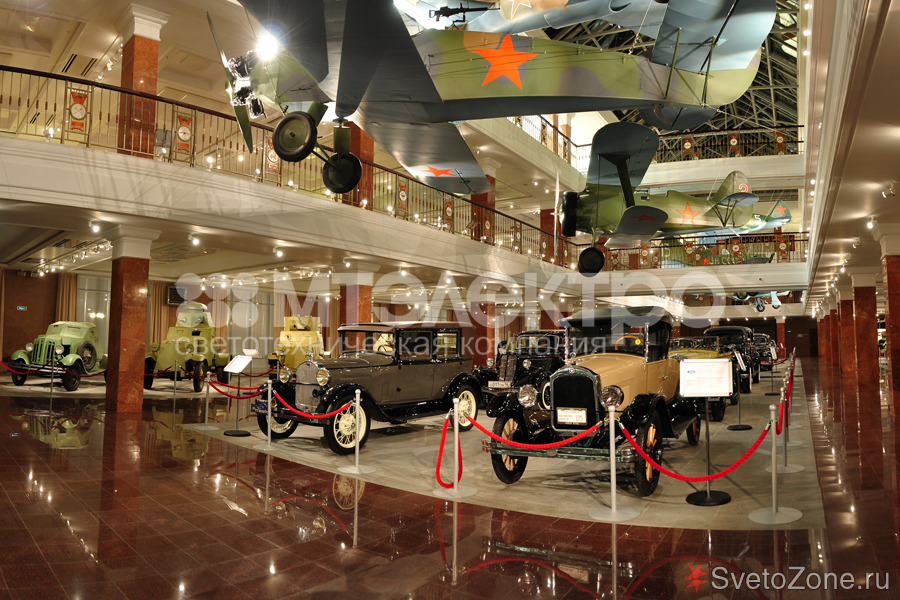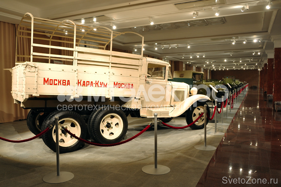 При создании экспозиционного освещения, перед проектировщиками стояла задача создать такую систему освещения, которая бы позволяла максимально эффектно выявить экспонаты с их особенностями и принадлежностью к различным вехам в истории, сформировать комфортную для длительного пребывания световую среду с четкой ориентацией в пространстве, а также создать определенное настроение и атмосферу. В качестве осветительных приборов использованы споты Artzoom компании Fagerhult. Каждый прибор снабжен потенциометром, регулятором раскрытия пучка света, шторками и штатными светофильтрами. В качестве источников света используются галогенные лампы мощностью 75Вт. Использование осветительных приборов со светом классических ламп накаливания в полной мере позволяет осветить экспонаты, выявить формы, текстуры и элементы отделки. А мягкий теплый белый свет галогенных ламп с естественной цветопередачей создает уникальные ощущения. |