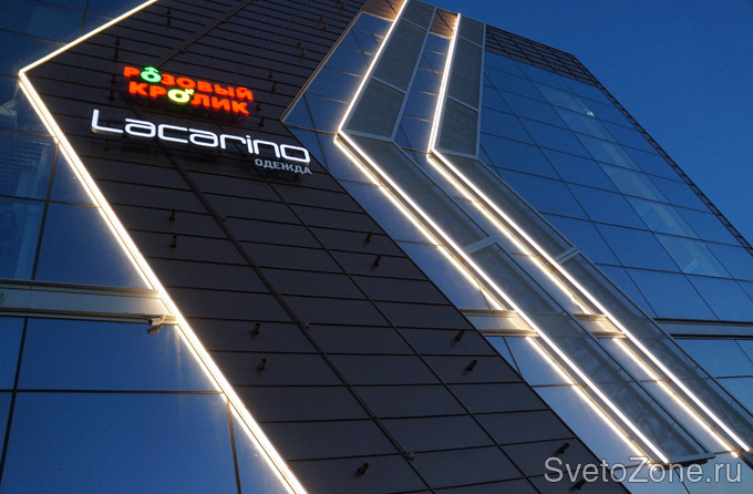 Используемое оборудование: более 130 светодиодных прожекторов серии IntiTUBE производства "IntiLED". Метровые светильники IntiTUBE с цветовой температурой 3200К (теплый белый свет) создают непрерывные световые линии непосредственно на стеклянном фасаде комплекса, формируя динамичный ночной облик торгового центра. Лаконичная и в то же время яркая светодиодная подсветка фасада подчеркивает функциональное назначение здания и привлекает внимание посетителей.