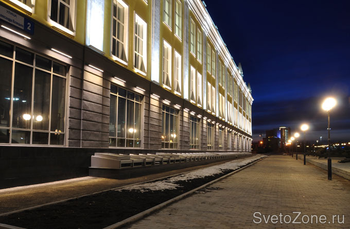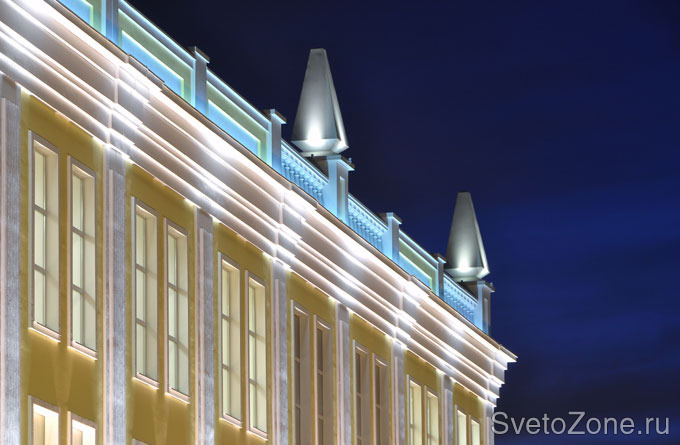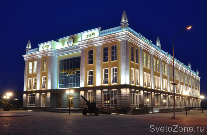 Используемое оборудование: Концепция художественной подсветки фасадов здания основана на комбинации общего и локального освещения, при этом главную роль играет акцентирование сложных конструктивных элементов, колонн и балясин, установленных на кровле выставочного центра. В проекте использованы метровые светодиодные прожекторы серии IntiLINE с различной цветовой температурой (4200 К и 3200 К) и вторичной оптикой (6°, 12х48°).