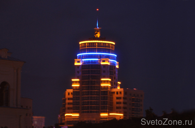 Используемое оборудование: Выбор линейных светильников серий IntiLINE и IntiTUBE, а также светодиодных прожекторов серии IntiRAY позволил создать оригинальное световое решение, подчеркнувшее архитектурные особенности здания и способствующее формированию нового облика исторического центра города. В общей сложности в проекте задействовано более 260 светильников производства IntiLED со светодиодами синего и янтарного цвета.