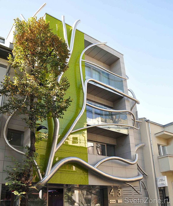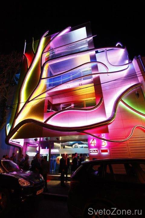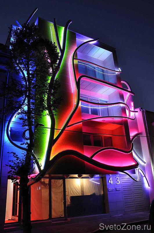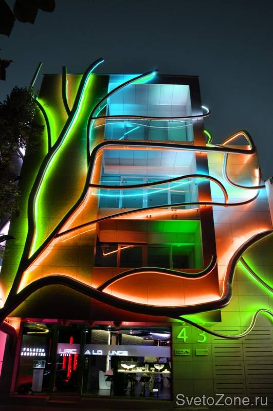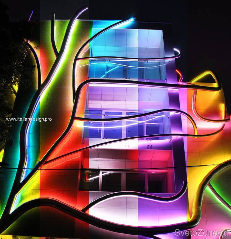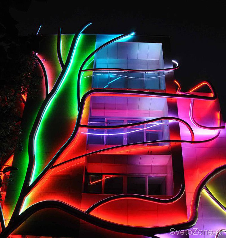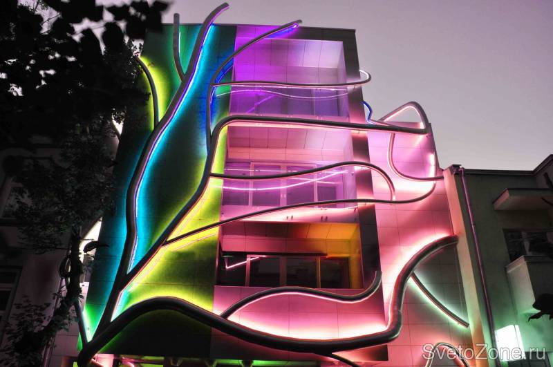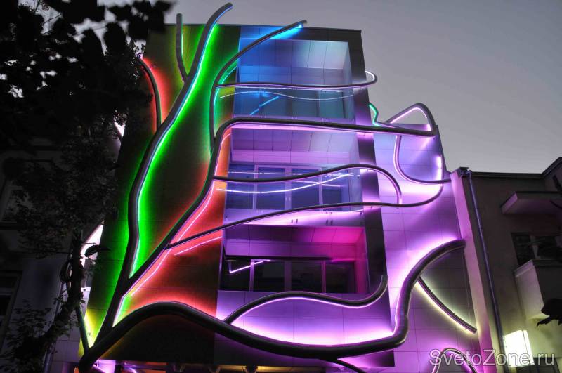 В качестве основного инструмента для реализации концепции декоративного освещения выбрана гибкая светодиодная лента GRIVEN LOOSELED. Около 140 метров RGB ленты с разрешением 40 светодиодов на метр длины смонтировано в ПВХ профиле со степенью защиты IP65 и установлено позади конструкции металлического дерева. Повторяя контуры растения, плавное течение цветного света и теней обволакивает поверхности фасада и благодаря созданной динамике оживляет его восприятие.