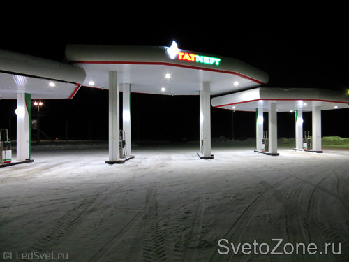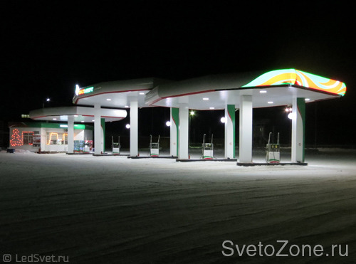 У АЗС освещение под навесом обеспечивается встраиваемыми и накладными источниками света с различной степенью защиты. На первый план выходит степень защиты светодиодного светильника, дающая ему право быть использованным в тех или иных условиях эксплуатации. Применили УСС 36 АЗС (IP 67).