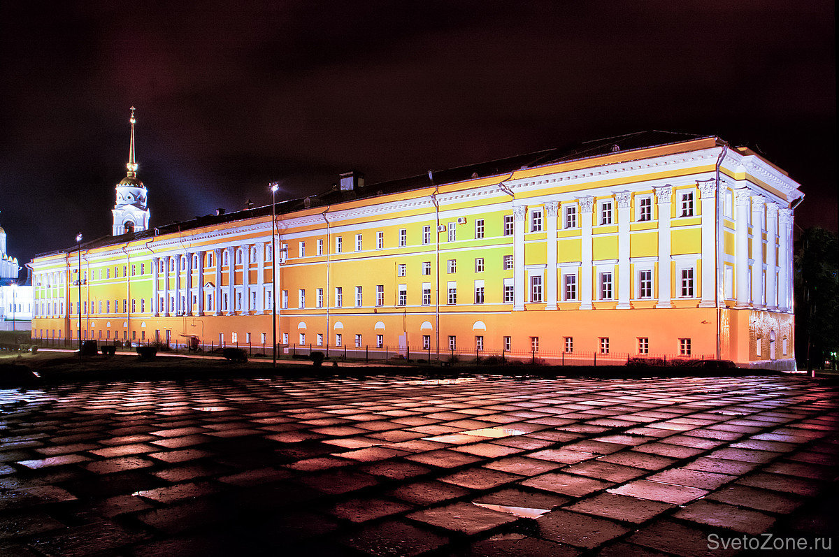 Используемое оборудование: светодиодные прожекторы серии IntiRAY c различной оптикой (15°, 26°, 38х23° и 42°) со светодиодами теплого белого цвета свечения. Световое оборудование установлено на опорах, что позволяет равномерно осветить здание, избежав при этом вмешательства в фасады уникального памятника архитектуры эпохи русского классицизма. С наступлением темноты рассеянный свет будто естественным образом возникает из рельефа фасада, не только подчеркивая пространственную глубину архитектурного комплекса, но и создавая общую атмосферу торжественности и гармонии.