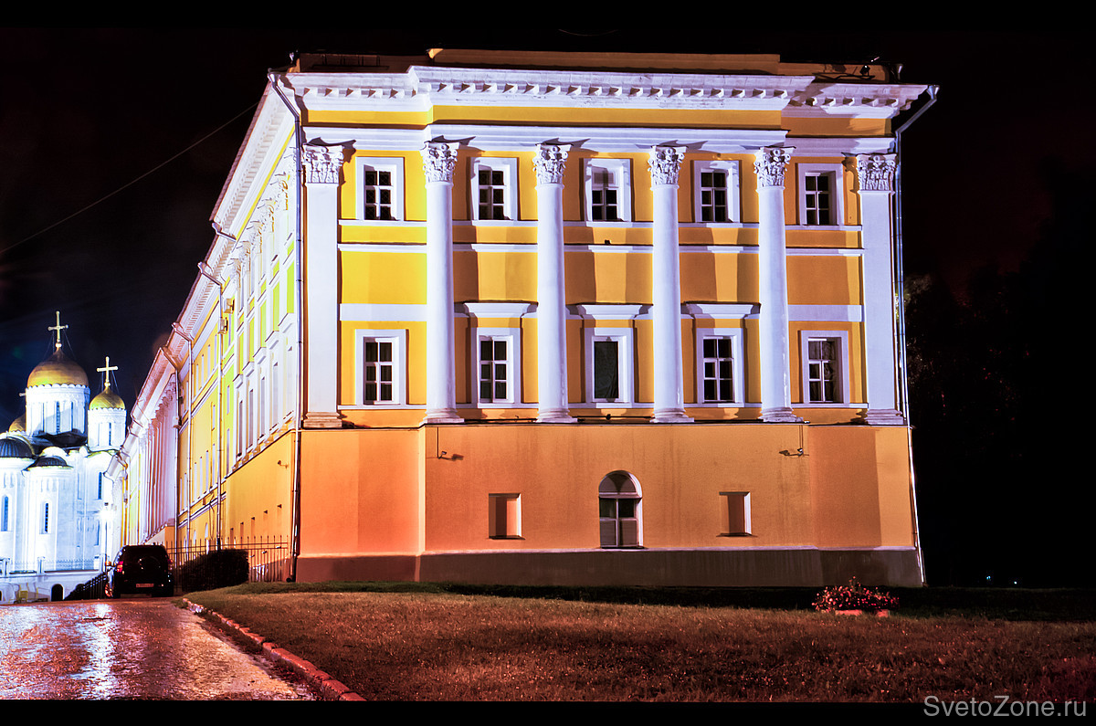 Информация о проекте: Музейный комплекс "Палаты" (здание Присутственных мест, 1785-1790 гг.) располагается в самом центре Владимира, в глубине старинного парка с аллеями и фонтанами. Сейчаc здесь размещен Культурно-образовательный центр Владимиро-Суздальского музея-заповедника. Как и в проекте наружного освещения любого исторического объекта, в случае с "Палатами" необходимо было сохранить индивидуальный образ здания и композиционную целостность объекта. Оптимальным приемом в данном случае является применение заливающего освещения, позволяющего осветить здание равномерно от фундамента до крыши. |