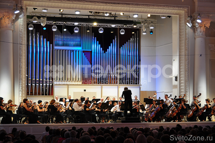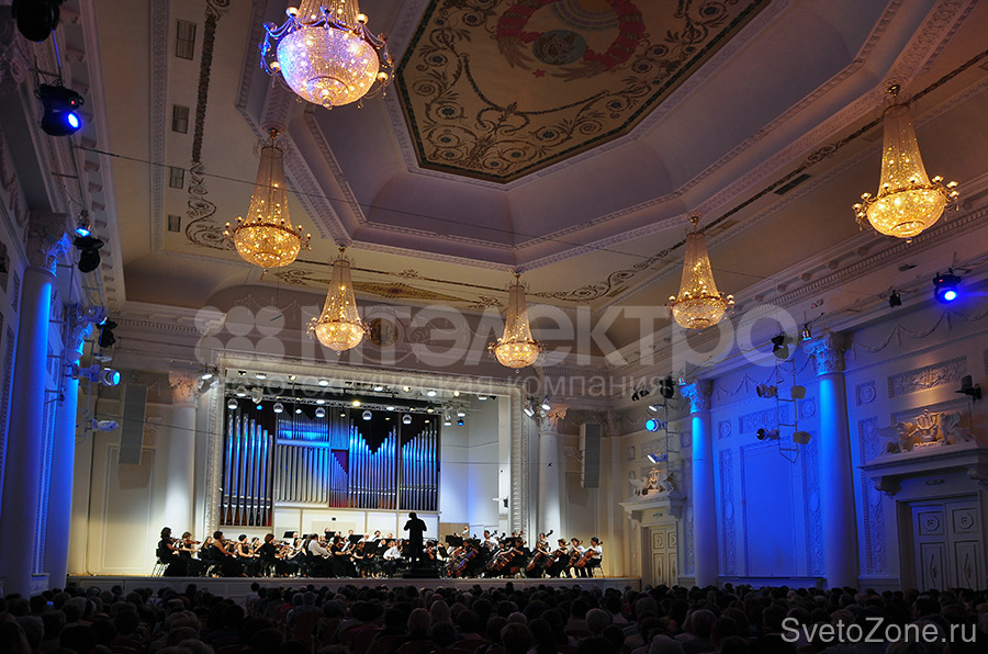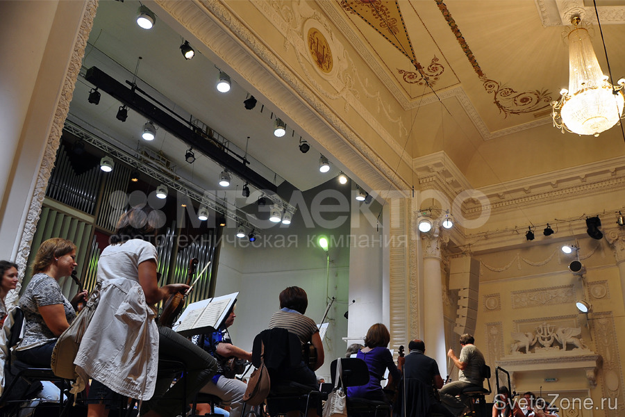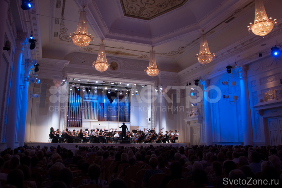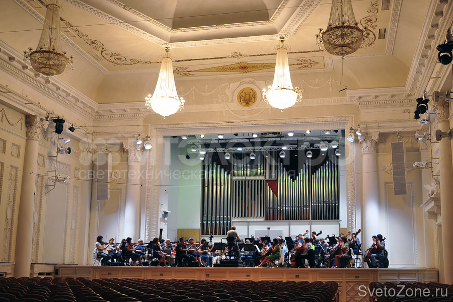 Решение: В качестве традиционного источника белого света было применено высококачественное динамическое LED-оборудование, которое позволило создать комфортную для музыкантов и зрителей световую среду, в полной мере решить проблему теплового излучения от осветительных приборов благодаря великолепной системе охлаждения. Также световая установка позволяет существенно сократить затраты на освещение, поскольку требует значительно меньше электроэнергии для поддержания комфортной температуры излучения за счет технических характеристик и гибкой системы управления.
