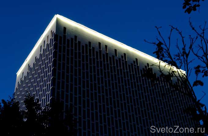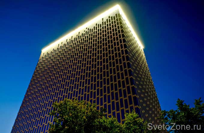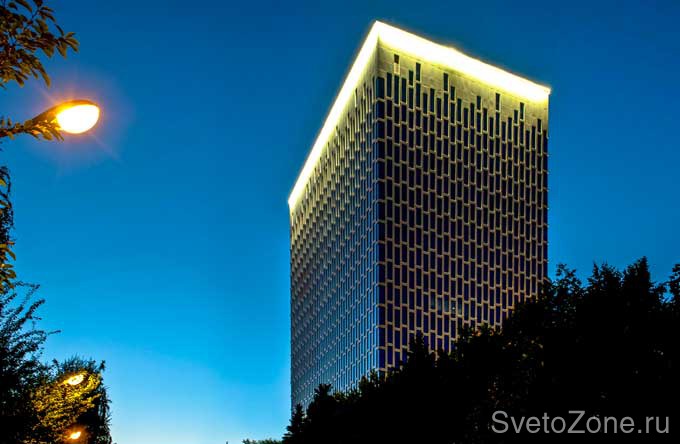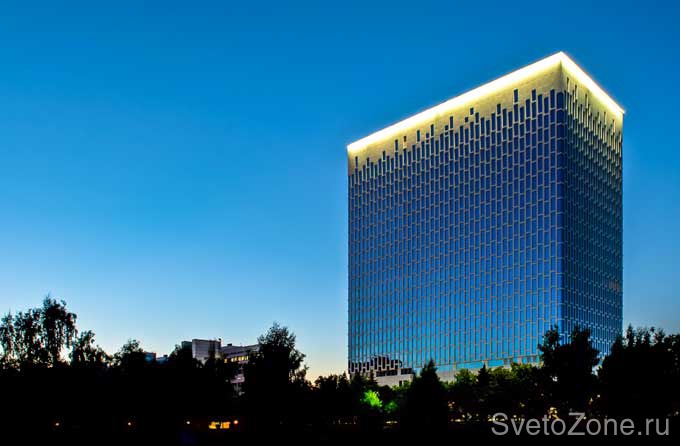 Используемое оборудование: Заливающее освещение верхних этажей, реализованное с помощью линейных светильников серии IntiLINE с цветовой температурой 5200 К, подчеркивает высоту здания и нестандартные архитектурные решения фасадов.