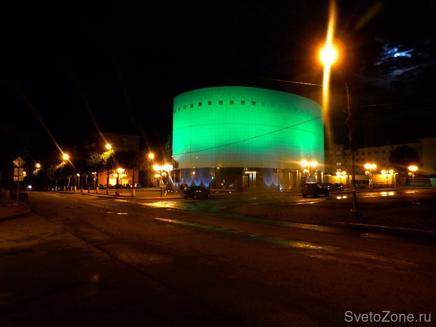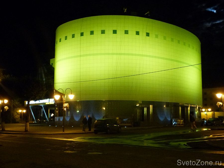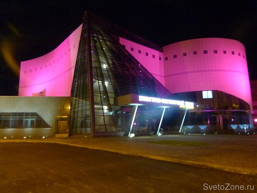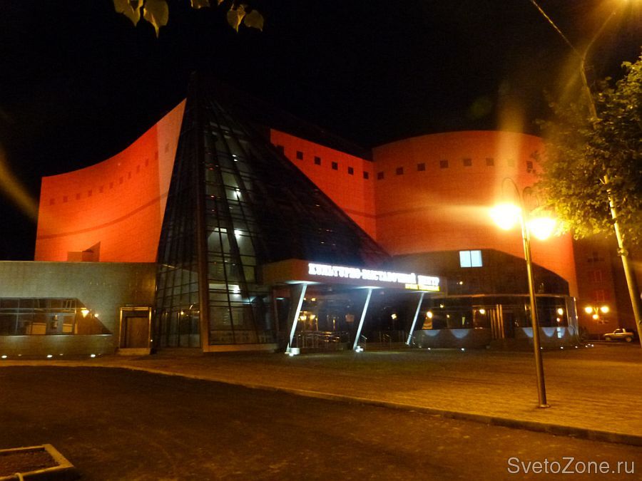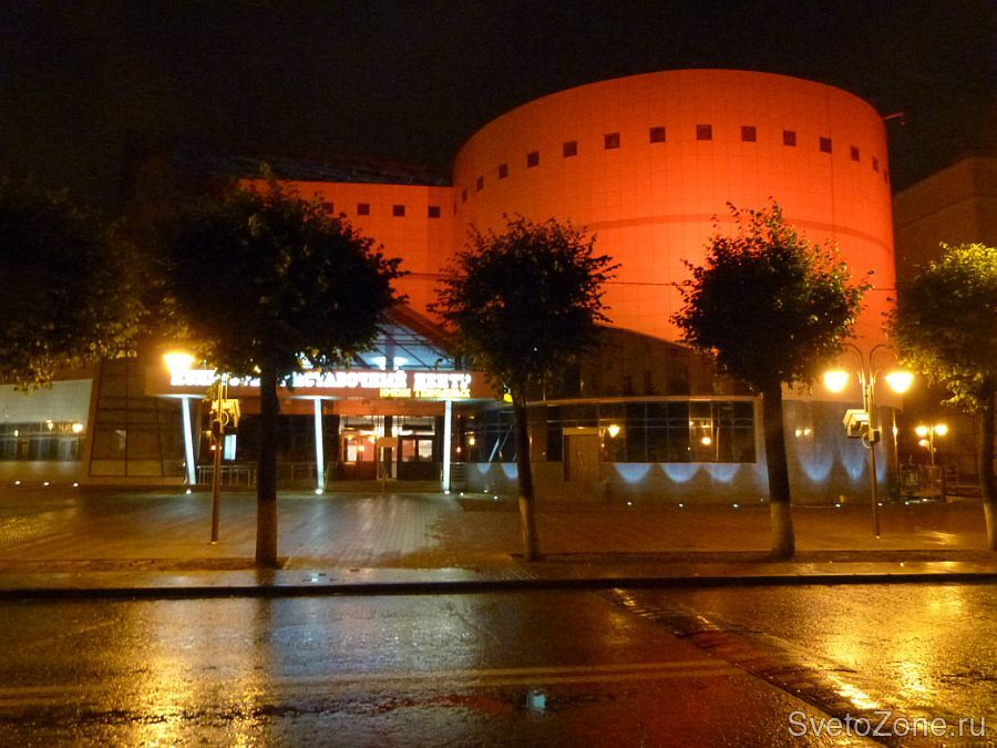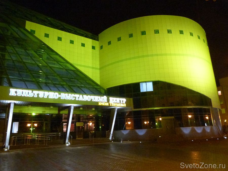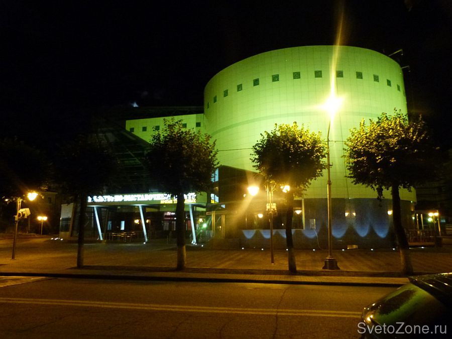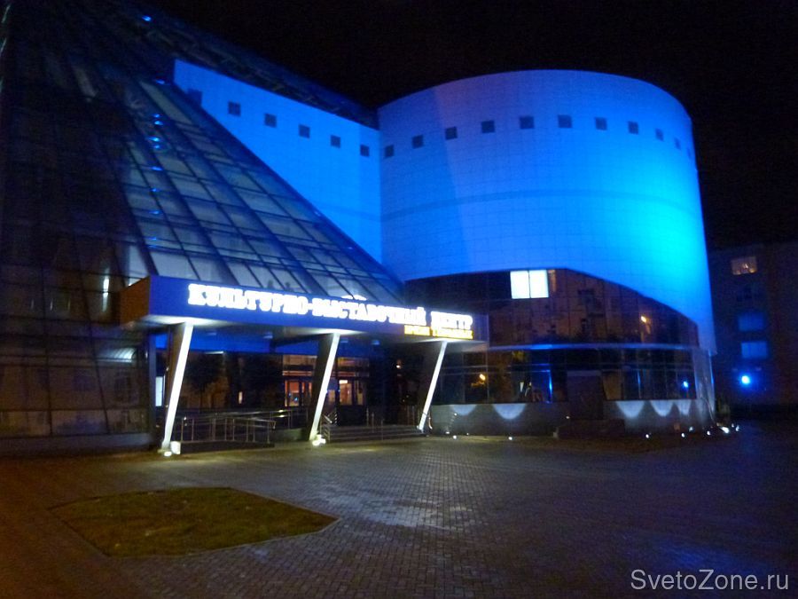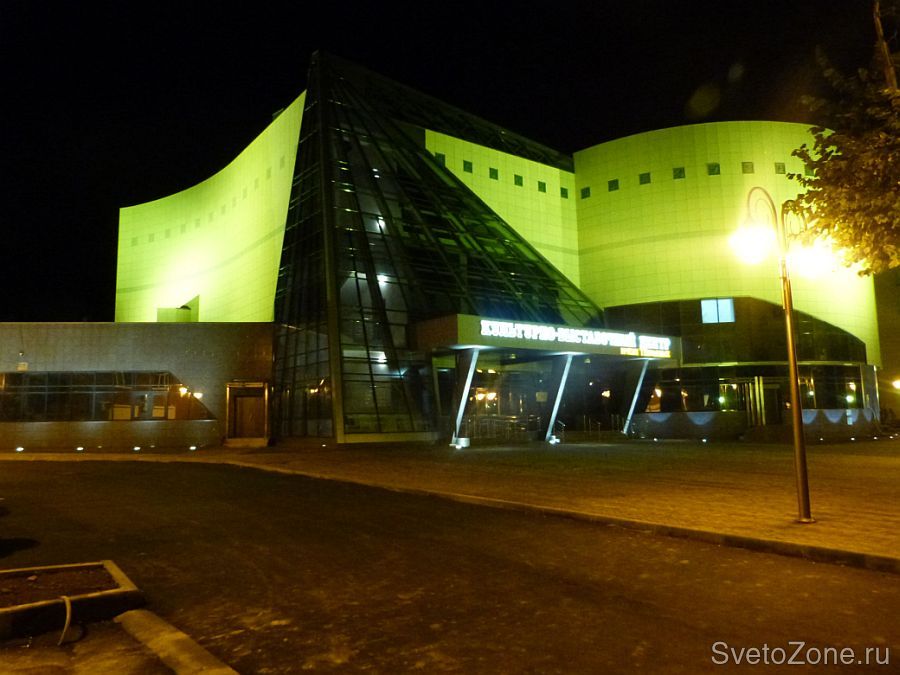 В качестве основного приема архитектурно-художественной подсветки здания КВЦ использован метод заливающего освещения. 13 прожекторов GRIVEN COLOSSEO OS CYM 1000 смонтированы на опорах по периметру здания. Опоры освещения установлены на различном удалении вдоль траектории фасадов, в связи с чем каждый из прожекторов оборудован индивидуальным фильтром, позволяющим добиться равномерного светового распределения по поверхностям стен и обеспечить однородность освещенности.