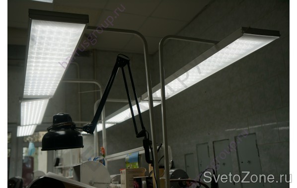 Основное освещение выполнено светодиодными светильниками ДВО01-32-001, а освещение рабочих мест линейными светильниками ДПО02-39-001. Очевидно, что уровень освещенности значительно превышает освещенность от люминесцентных светильников. |