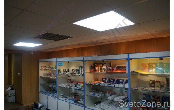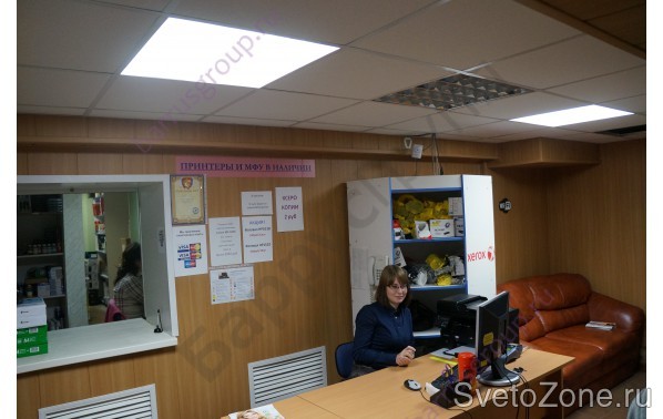 В отдельном помещении для персонала произведена замена четырех традиционных светильников ЛПО4х18 на два встраиваемых светодиодных светильника ДВО01-32-001 со световым потоком в 3000 Лм на 32Вт. Несмотря на низкие потолки в помещении (2,2 метра), распределение светового потока равномерное. Это создается за счет применения в светодиодном светильнике немецкого стекла Plexiglass. решили проблемы с пульсациями и низким уровнем освещенности. |