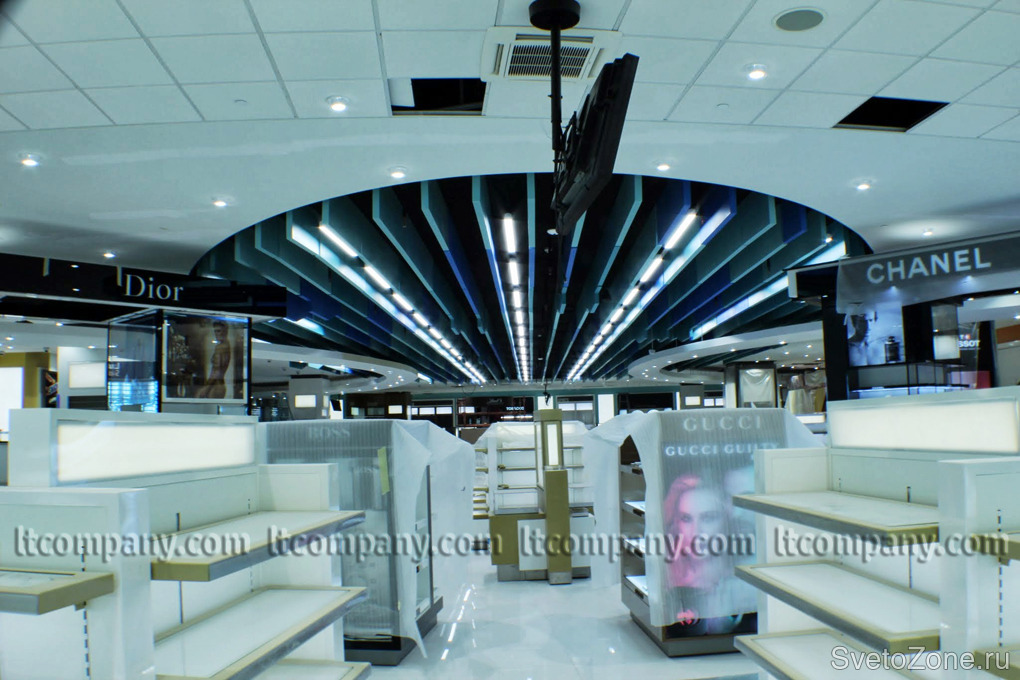 Энергоэффективное освещение зоны Duty Free, элегантно вписывающееся в интерьер торговой зоны.