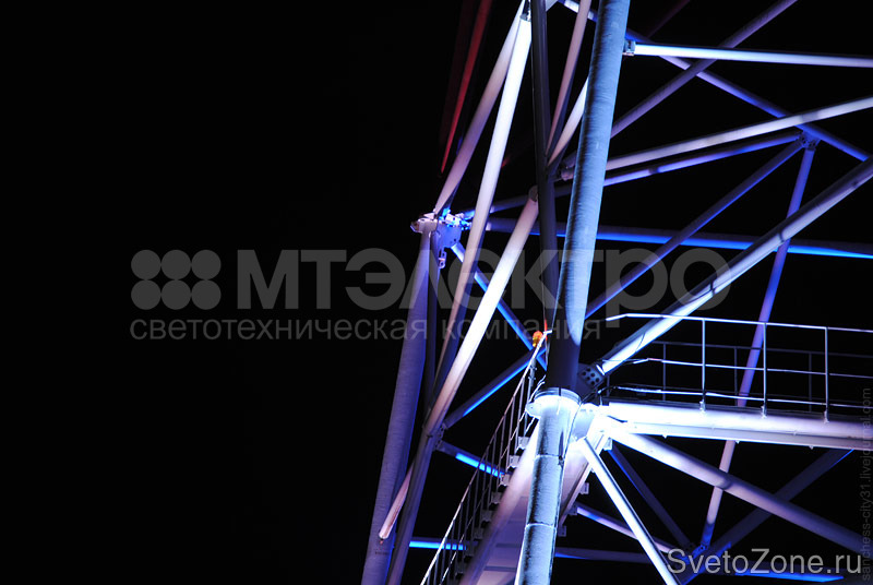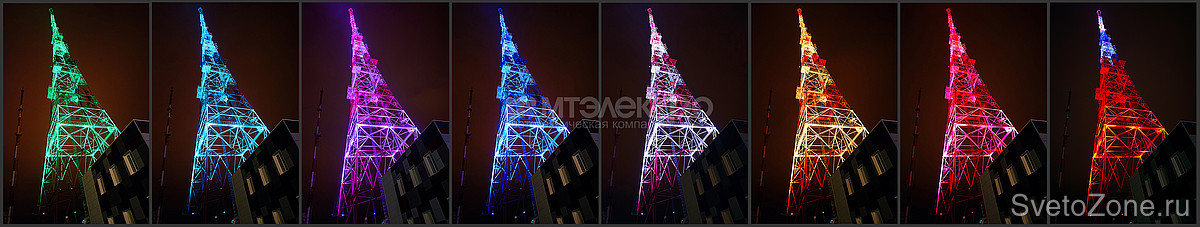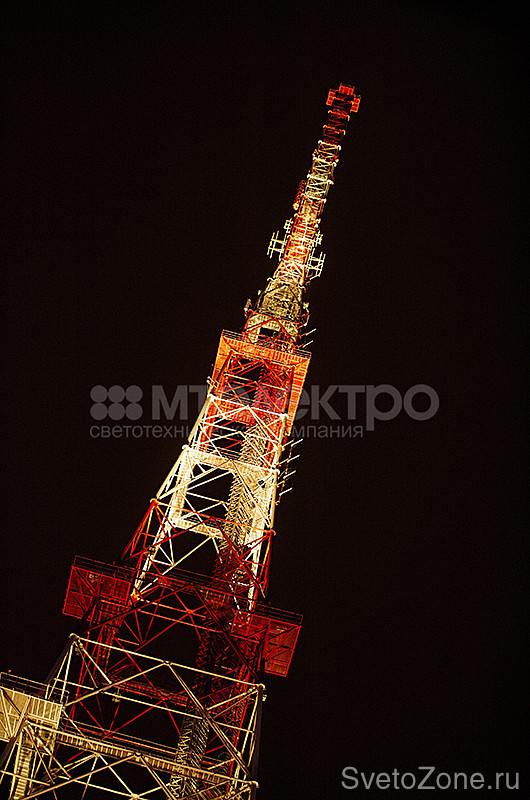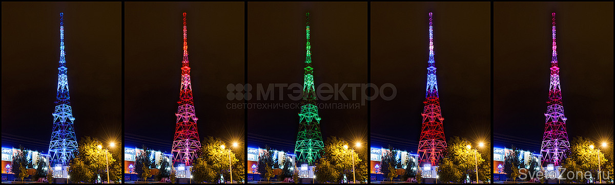 Важной задачей было выделить конструкцию в вечерне-ночное время с помощью архитектурно-художественной подсветки для того, чтобы превратить ее в изящную световую доминанту, которая стала бы новым символом и украшением города. Уникальная светодинамическая подсветка телебашни выполняется при помощи современного энергоэффективного оборудования. Для подсветки использовано 24 цветодинамических прожектора GRIVEN POWERSHINE D MK2 RGBW мощностью 0,6 кВт. Оборудование расположено на трех уровнях – 10, 90 и 156м. Мощные светодиодные прожекторы с узкоугольной оптикой «спот» обеспечивают равномерное цветовое покрытие на расстоянии до 80 м. Выбор оптики приборов и их расстановка выполнены таким образом, что иллюминация освещает всю конструкцию – от основания до верха – и подсвеченными являются как внешние конструкции башни, так и внутренние. Система синтеза приборов основана на смешении красного, синего, зеленого и белого цветов, что позволяет добиться чистоты и насыщенности оттенков. Выбор светодиодных источников света обусловлен их долгим сроком службы, стабильностью светотехнических параметров во время эксплуатации, а также широкими возможностями в создании различных светоцветовых эффектов. Система управления осветительной установки открывает широкие возможности для получения множества световых сценариев – от плавных перетеканий по всем контурам до динамичного стробирования. Для крепления осветительных приборов на стойках и на конструкциях башни в конструктив интегрированы индивидуально разработанные кронштейны, которые позволяют удобно обслуживать приборы и не нарушают дневной облик конструкции. |