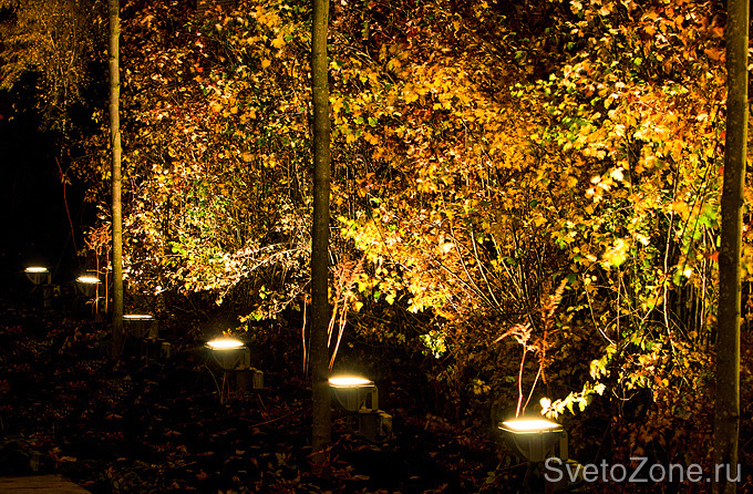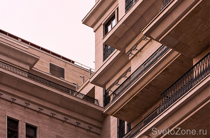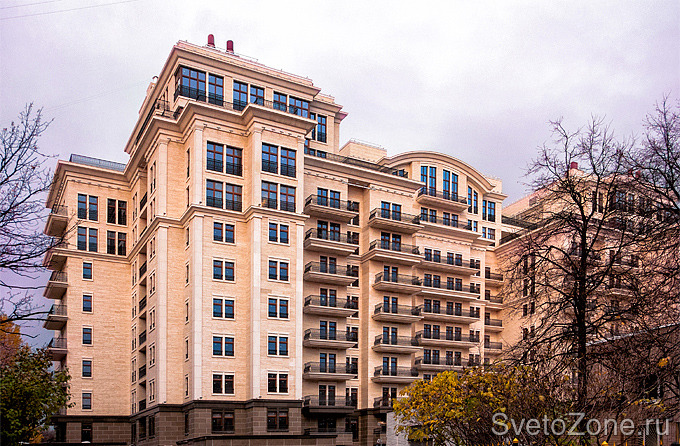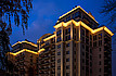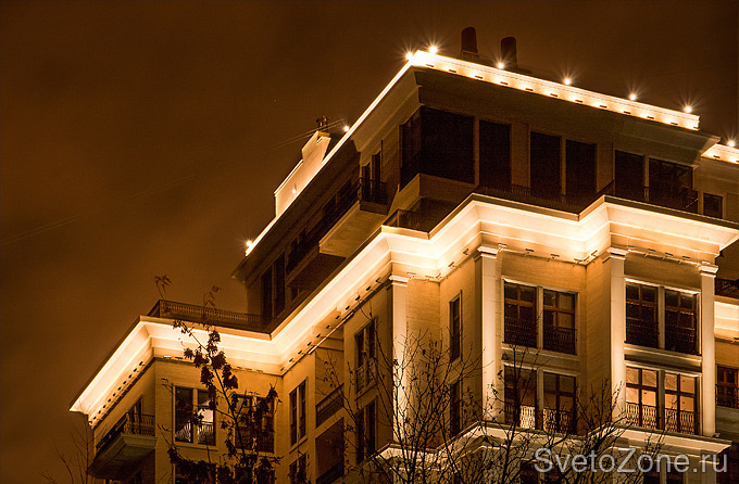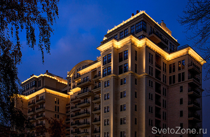Используемое оборудование: Периметр верхних ярусов здания обозначен с помощью линейных светодиодных светильников серии IntiLINE длиной 30 см. В качестве источников света в приборах используются светодиоды с цветовой температурой 3200 К (теплый белый свет). Прожекторы серии IntiRAY с различной оптикой подсвечивают межоконные пространства верхних этажей комплекса, подчеркивая нестандартную высоту окон видовых квартир. Установленные на опорах светильники IntiRAY, использованные для освещения прилегающей территории, освежают ландшафт и выполняют функцию наружного освещения придомовой зоны. В общей сложности в проекте архитектурного освещения ЖК "Андреевский" задействовано более 500 светодиодных светильников производства "IntiLED".