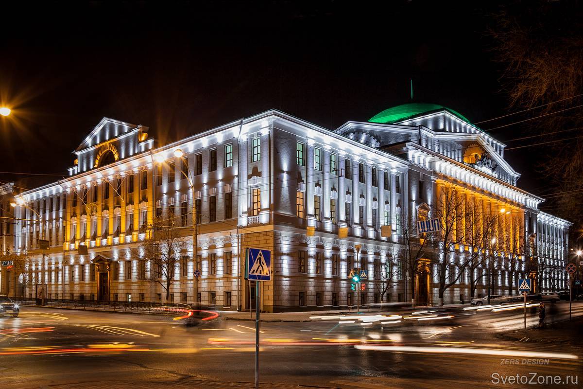 Гармония неоклассики и подчеркнутая прорисовка архитектурных форм и деталей стали основой для концепции светотехнического проекта. Здание завершает двойной купол, спроектированный профессором П. И. Дмитриевым. Для подсветки этого архитектурного элемента специалистами компании «ЦЕРС» были разработаны оригинальные светодиодные светильники с изумрудным свечением. Также в проекте было смонтировано порядка 400 специально разработанных светодиодных светильников. Система архитектурно-художественного освещения здания разделена на группы включения. Данное решение дает возможность включать оборудование по мере необходимости в будние или праздничные дни, либо использовать «экономное» освещение, что позволит сократить затраты на электроэнергию.