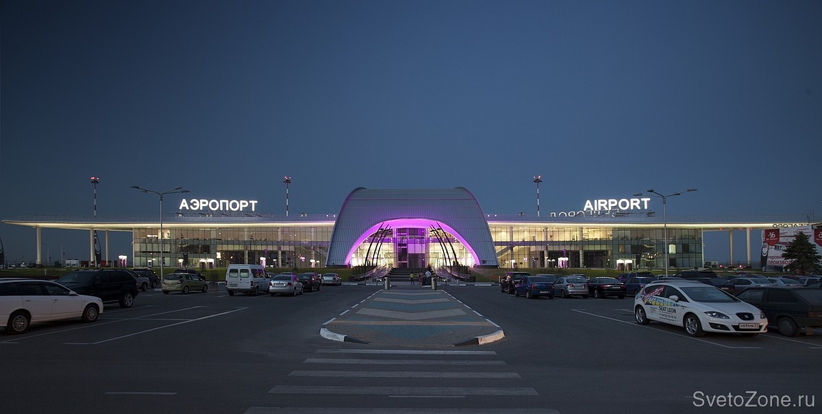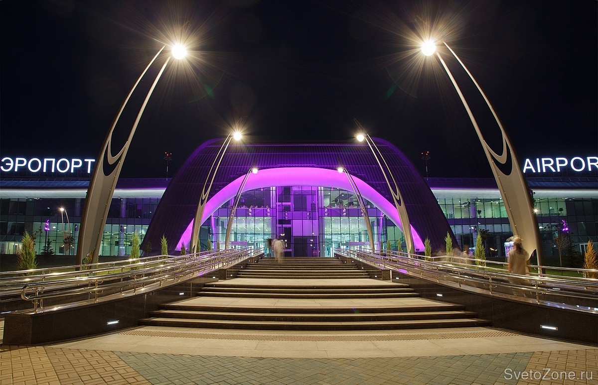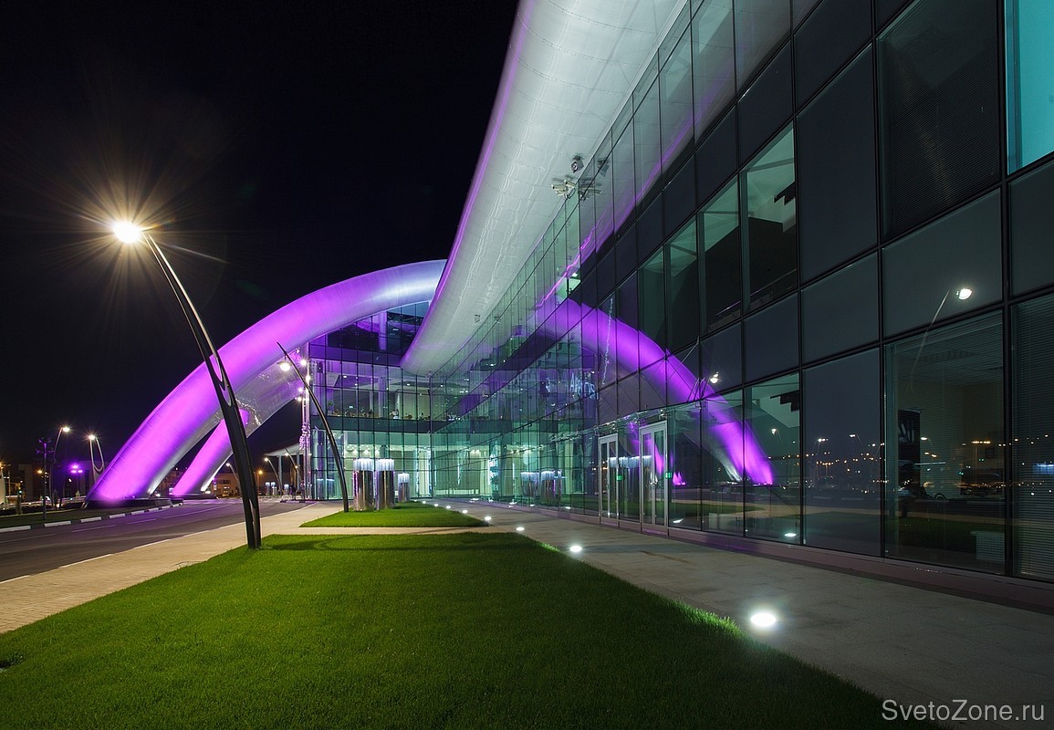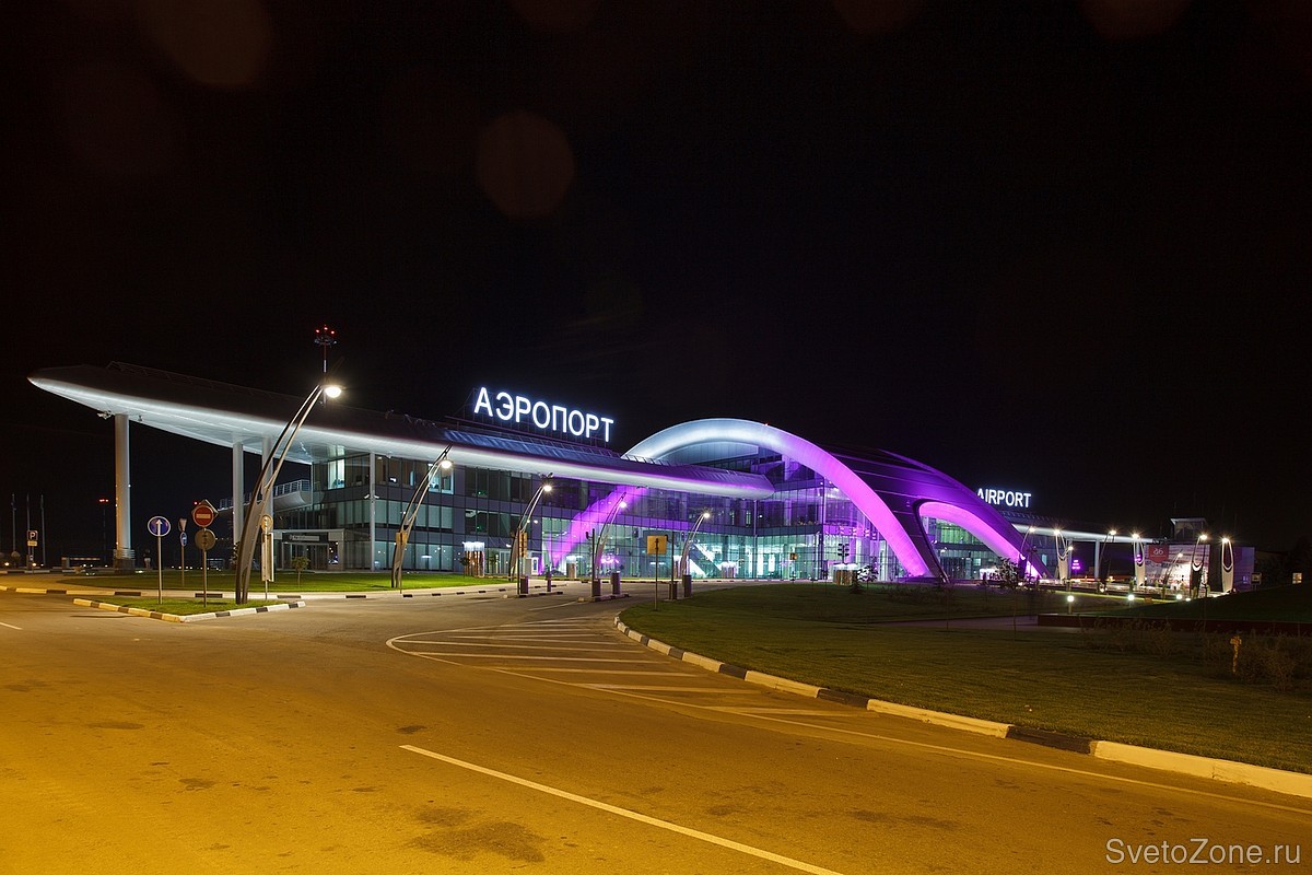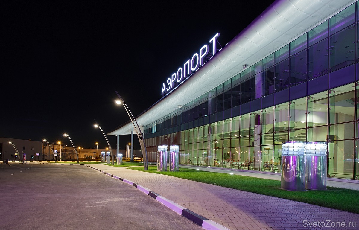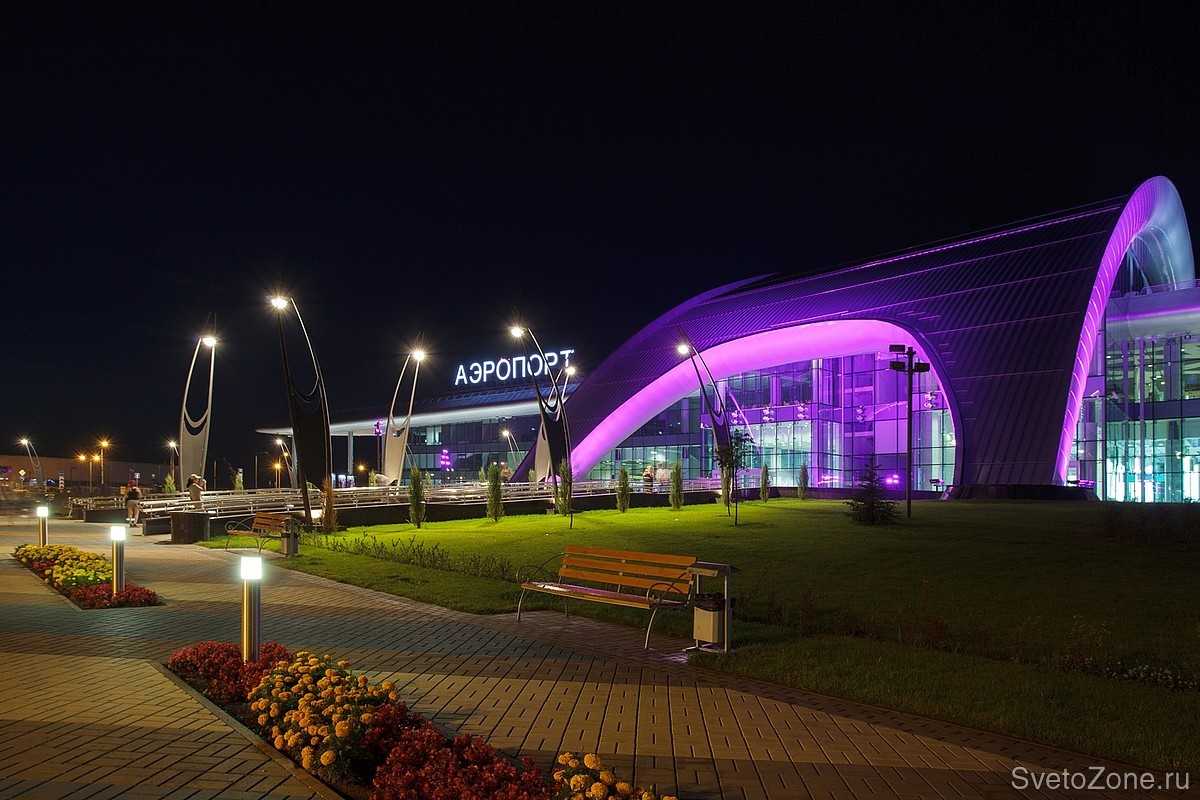 Архитектурно-художественная подсветка здания аэропорта в городе Белгород предусматривает использование повседневного, праздничного и ночного режимов освещения.