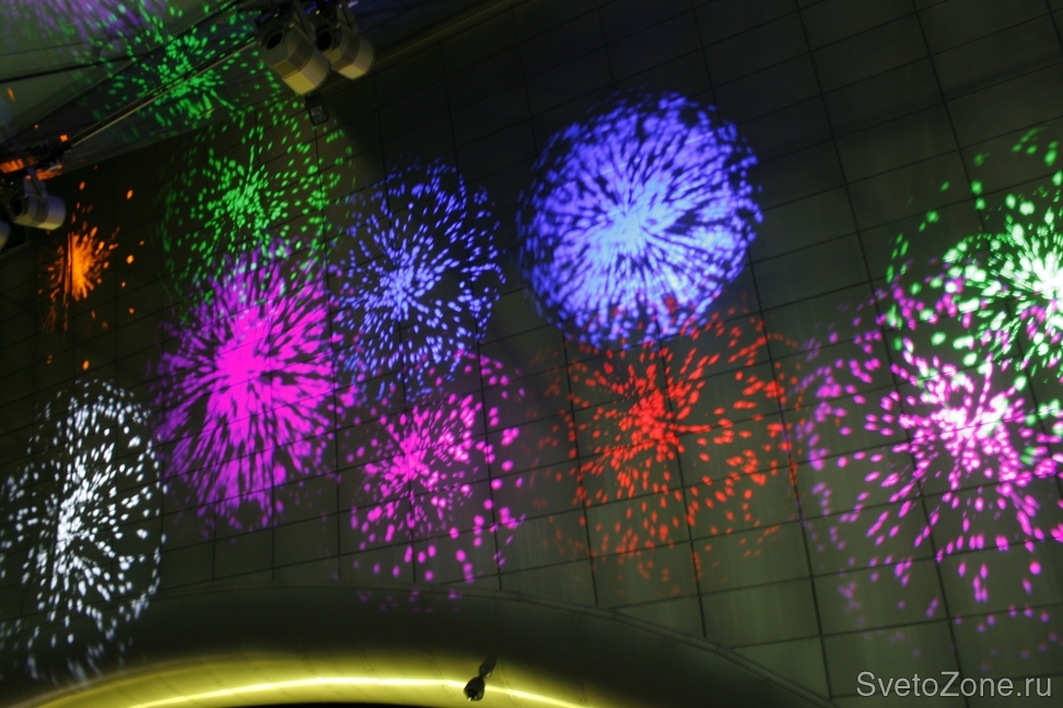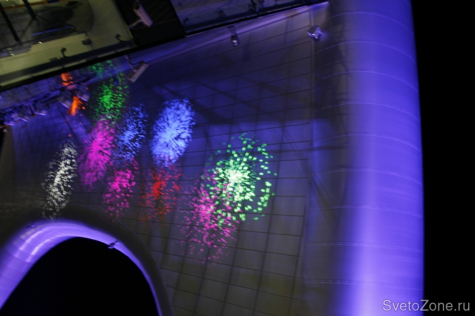 Внутренний арочный свод над центральным входом в здание аэропорта служит поверхностью для проецирования динамической последовательности «Салют» с использованием установки на светодиодных проекторах.