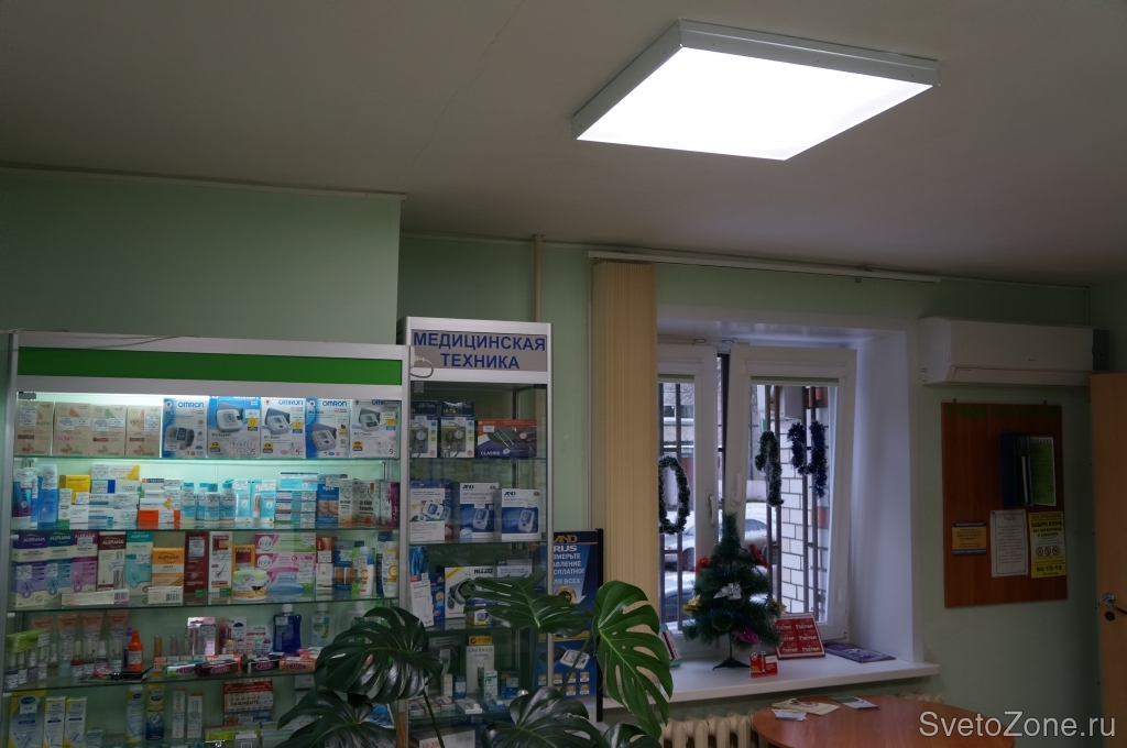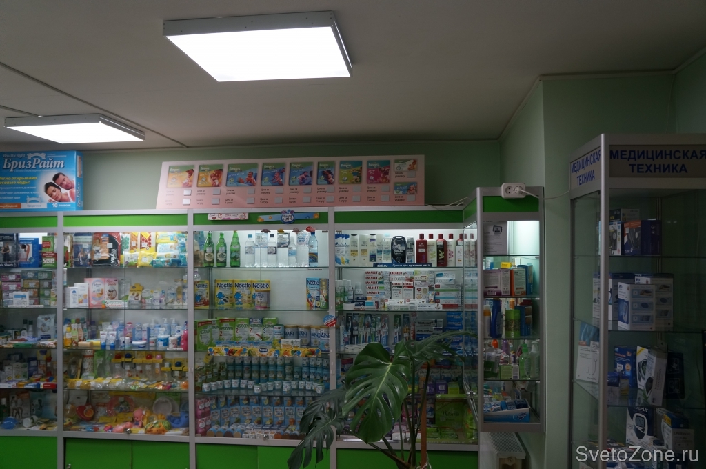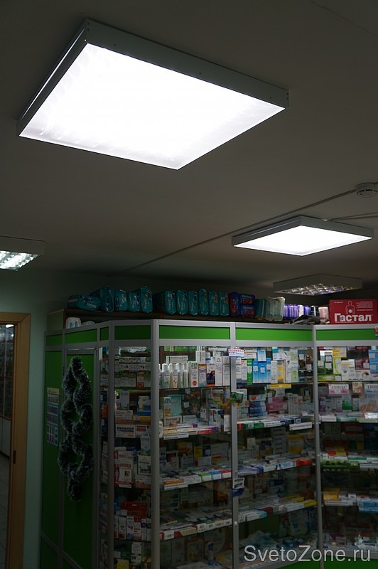 Дилером компании "БаррусГрупп" был реализован проект освещения аптеки небольшого размера. Целью в данном помещение было улучшение освещенности: со старыми люминесцентными лампами света на торговой площади явно не хватало. Руководством компании-клиента было принято решение о переоснащении всех светильников на светодиодные ДПО01-32-001. После установки оборудования освещенность явно увеличилась - задача была выполнена. Экономия на электроэнергии при сравнительно небольшом количестве светильник не столь значительная, но все же она составила 70%. |