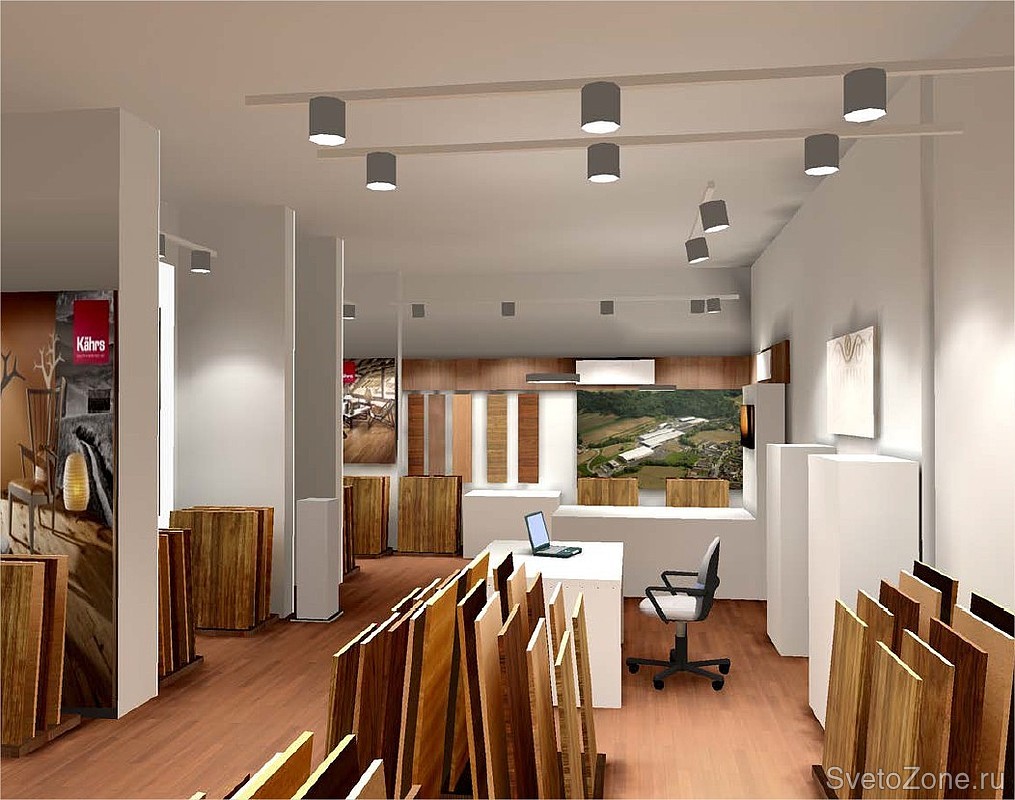 Для акцентного освещения экспозиции использованы современные светодиодные прожекторы на шинопроводах LIVAL GLIDER LED, общее освещение офисной части реализовано линейными люминесцентными светильниками с перекрывающимися источниками света HALLA LINA. |
