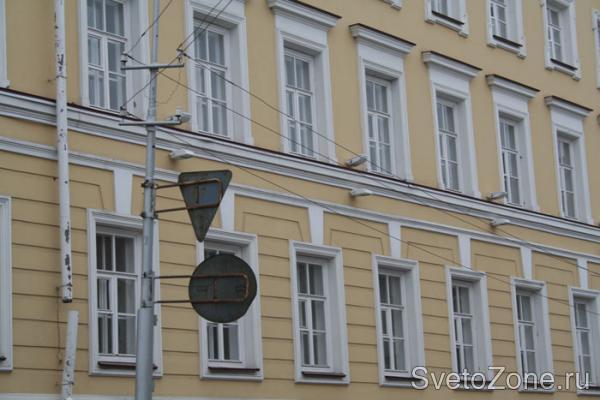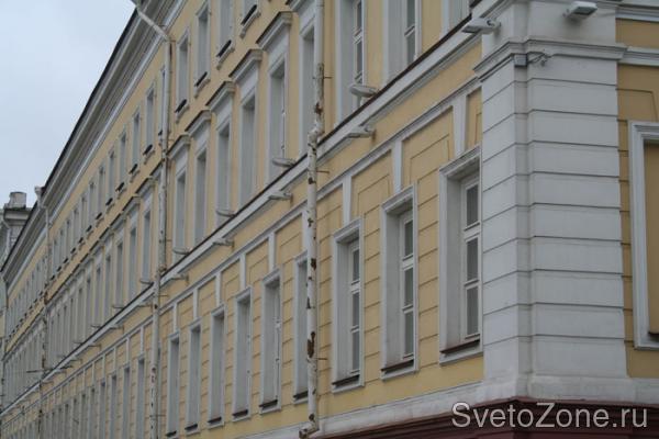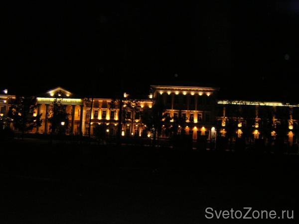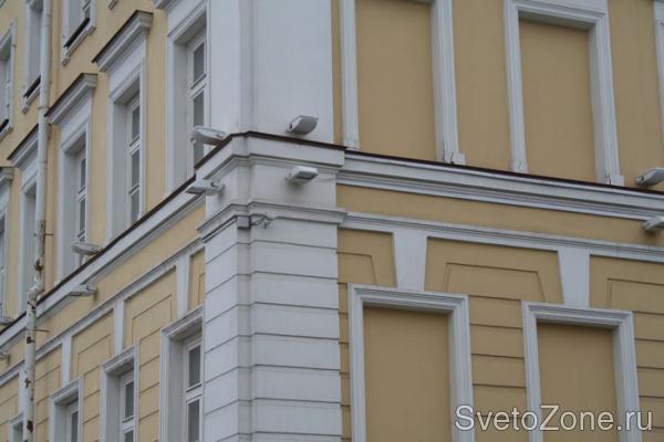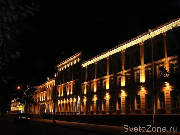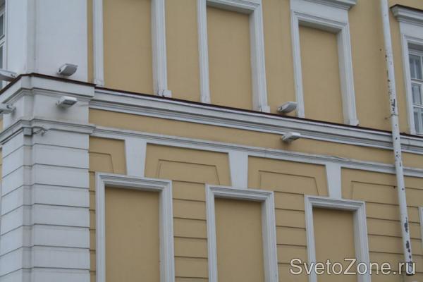 Данные осветительные приборы выполняют, в первую очередь, функцию архитектурной подсветки. Но, так как к основным преимуществам прожекторов относится их большая мощность, они способны осветить еще и достаточно обширную территорию вокруг корпуса, что придает не только зданию, но и вечерней улице очень праздничный вид, а также обеспечивает безопасность для пешеходов и автолюбителей.