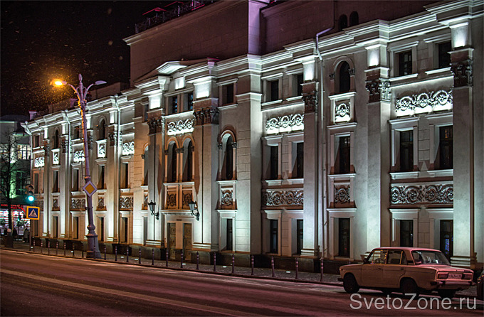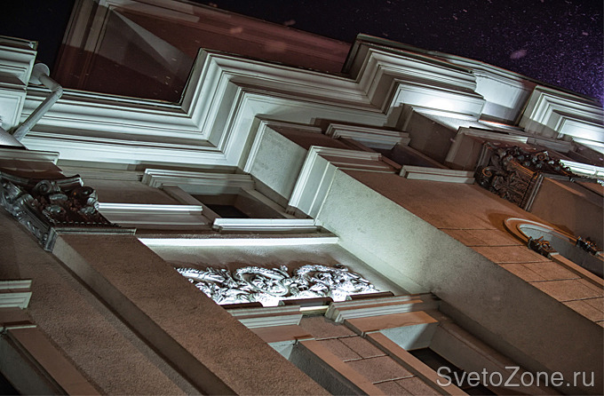 Используемое оборудование: Грунтовые светильники IntiGROUND создают мягкую световую заливку фасада, линейные светильники IntiLINE выделяют карниз и расставляют акценты на элементах лепнины, прожекторы IntiRAY подчеркивают серебристые капители.