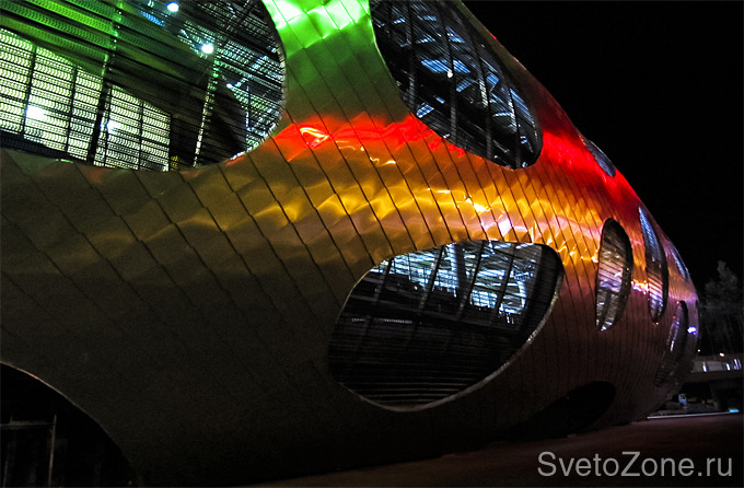 Используемое оборудование: Более 50 мощных RGBW прожекторов серии IntiSTARK были использованы для равномерной динамической подсветки фасада стадиона с опор. Высокая степень защиты от внешних воздействий IP66 и широкий температурный диапазон от -40 до +45°С делают прожекторы серии IntiSTARK универсальным решением для заливающего освещения больших площадей и спортивных объектов. Светодиодное оборудование, используемое в проекте освещения «Борисов-Арены», отвечает последним требованиям энергоэффективности и позволяет снизить расходы на техническое обслуживание благодаря долгому сроку службы.