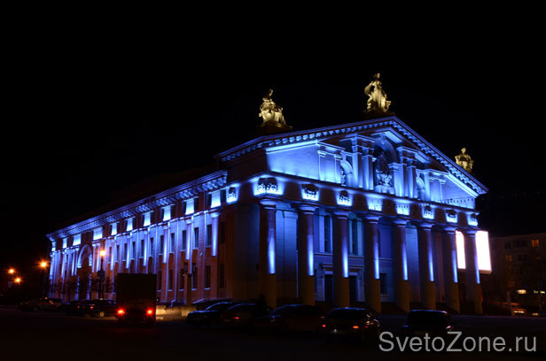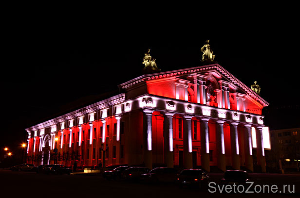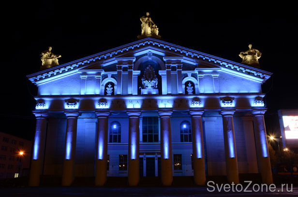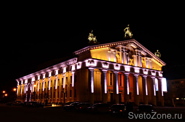 Для архитектурного освещения фасадов используется комбинация приемов локального и акцентного света, что позволяет сфокусировать внимание на главных деталях здания театра и лаконично подчеркнуть его формы. В темное время суток общий объем сооружения и составляющие архитектурные элементы выделены при помощи современных светодиодных прожекторов GRIVEN с синтезом цвета RGBW. Четко просчитанные углы нацеливания и выверенное расположение световых приборов способствуют задуманному алгоритму формирования теней, столь необходимых для светового моделирования пластических форм.