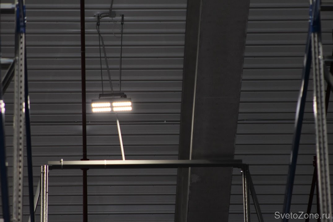 В силу необходимости установить светильники непосредственно под потолком требовался светильник с высоким световым потоком и хорошим равномерным светораспределением. Был выбран светильник HB LED 152 D64.