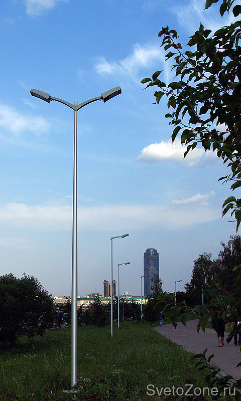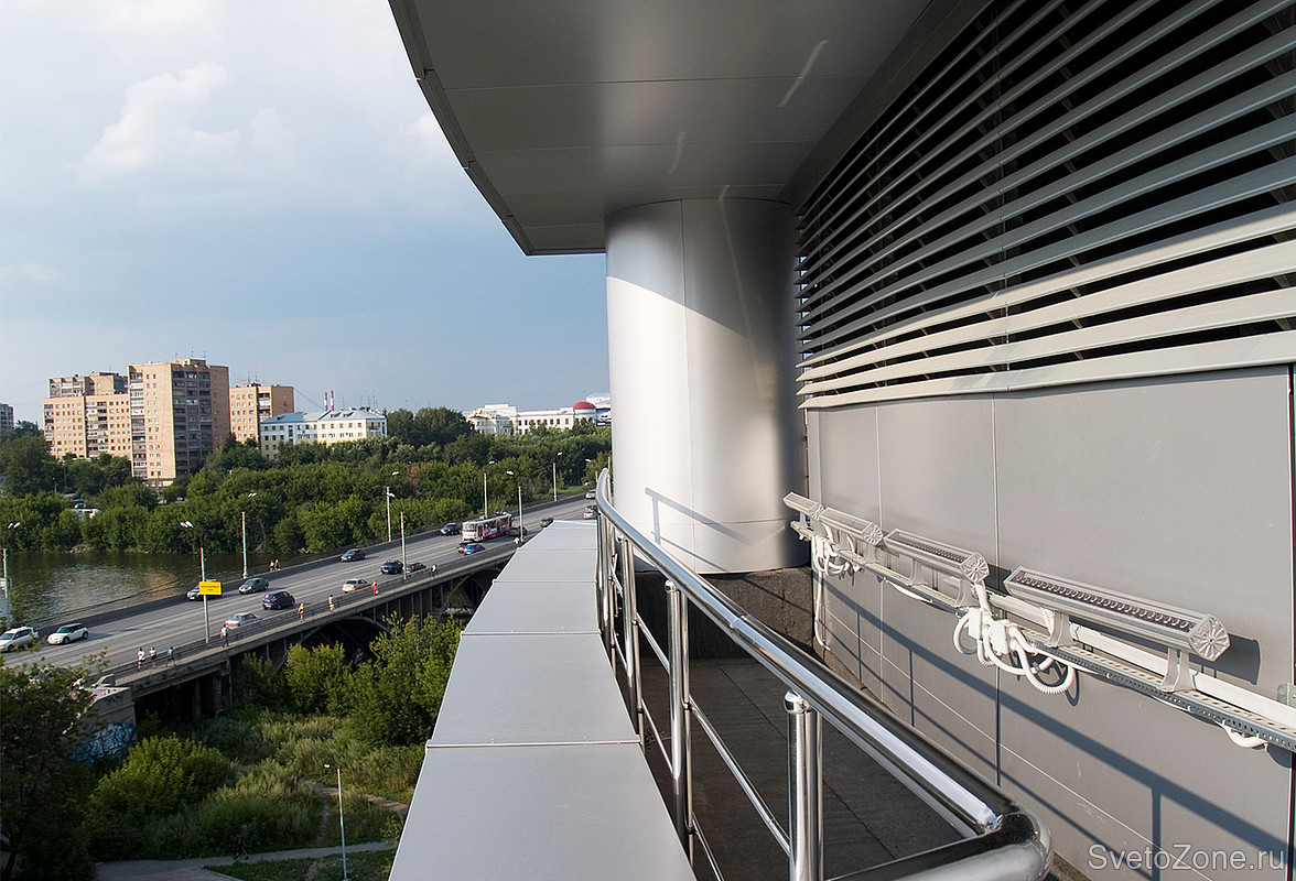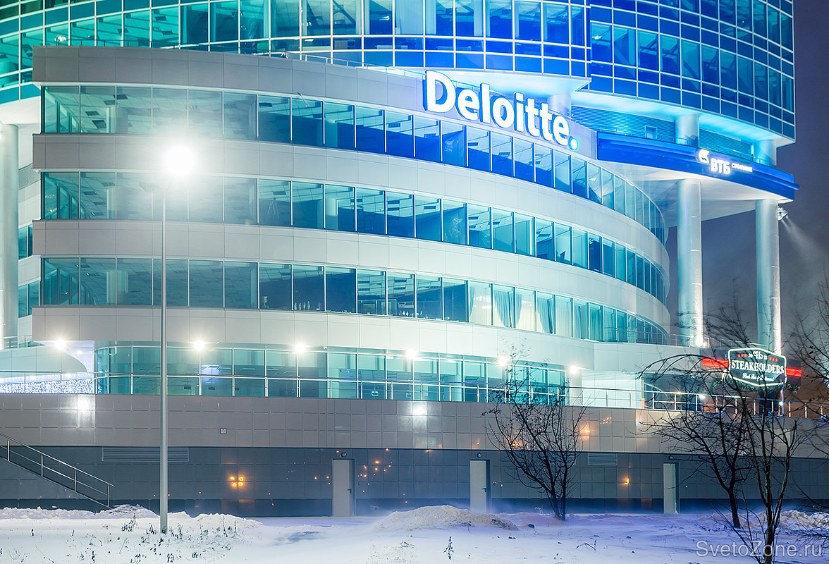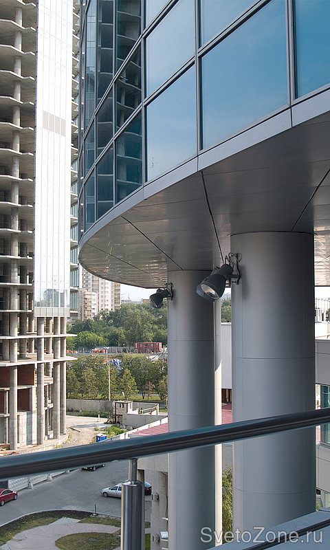 По периметру предусмотрена сложная градиентная заливка стеклянной части прожекторами с лампами холодного белого спектра свечения, в нижней прожекторами с лампами теплого белого спектра свечения. Теплый спектр заливки здания в нижней части обоснован необходимостью сочетания с освещением прилегающей территории. Оборудование для освещения прилегающей территории подобрано с учетом единой стилистики двух находящихся рядом зданий. Применены анодированные алюминиевые опоры освещения ROSA (Польша), светильники и кронштейны MARTINI (Италия). Опоры и светильники - малые архитектурные формы, которые находятся в непосредственной видимости, поэтому к подбору этих элементов мы подошли наиболее тщательно. Дополнительные акценты на фасаде придают зданию наибольшую выразительность. В нижней части по периметру здания приборами, встроенными в грунт и компактными прожекторами выделены колонны. На уровнях 18-го и 5-го этажей подчеркнуты колонны прожекторами с лампами холодного белого спектра свечения. Наиболее ярко выделен уровень первого этажа, по всему периметру установлены светодиодные приборы, встроенные в потолок. Сложная пластика фасадов подчеркнута линейной подсветкой в уровнях 4-го и 18-го этажей. Также на уровне 18-го этажа установлено светодиодное оборудование производства IntiLED (Россия) с синтезом цвета RGB. Использование светодинамики возможно в праздничные дни, в будние дни предложено использовать цветовой режим согласно корпоративному цвету компании. |