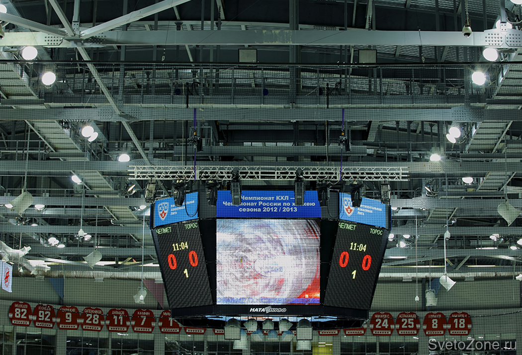 Благодаря профессионализму и грамотному выбору приборов освещения высокой яркости и низкого уровня слепящего эффекта, было создано максимально комфортное для спортсменов освещение. Реализованный проект позволил обеспечить наилучший уровень освещения, за счет чего эмоциональный и театральный эффекты для болельщиков на трибунах и по ту сторону телевизионного экрана значительно усиливаются, не мешая при этом выступающим спортсменам. Установленное оборудование отвечает всем нормам и требованиям к освещению ледовых арен, обеспечивая индекс цветопередачи не менее 65 и цветовой температуры не менее 5600К, освещая первые пять рядов трибун при телевизионной трансляции не менее 900 лк, и остальных рядов – не менее 700 лк. |