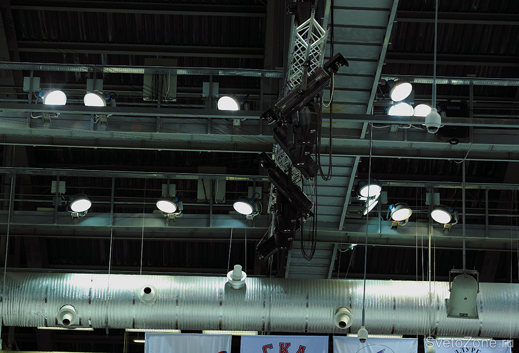 Осветительная установка поля и трибун предполагает несколько режимов эксплуатации: тренировка, игра, игра с телесъемкой и дежурное освещение. Для освещения ледовой арены используются приборы мощностью 1кВт с различной оптикой, для трибун – прожекторы мощностью 400 Вт и светильники с люминесцентными лампами. Среди них прожекторы Philips линейки ArenaVision, обладающие высокой выходной мощностью, оптической эффективностью, надежностью и легкостью монтажа.