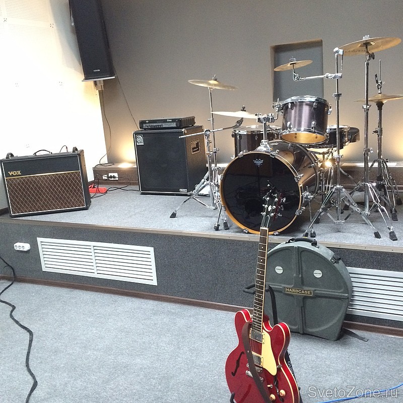 В проекте использовались: офисные светодиодные светильники БаррусГрупп ДВО01-32-001, подсветка ударной установки выполнена светодиодными светильниками Arlight в квадратном исполнении. |