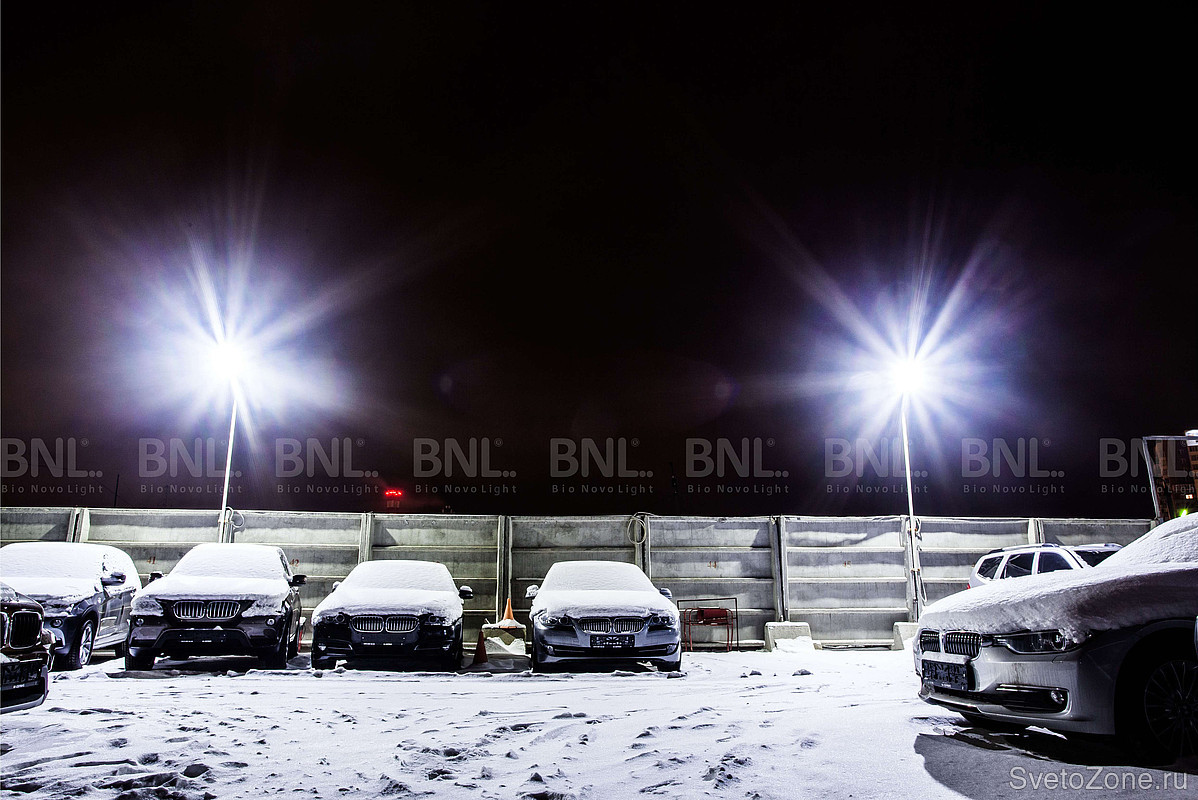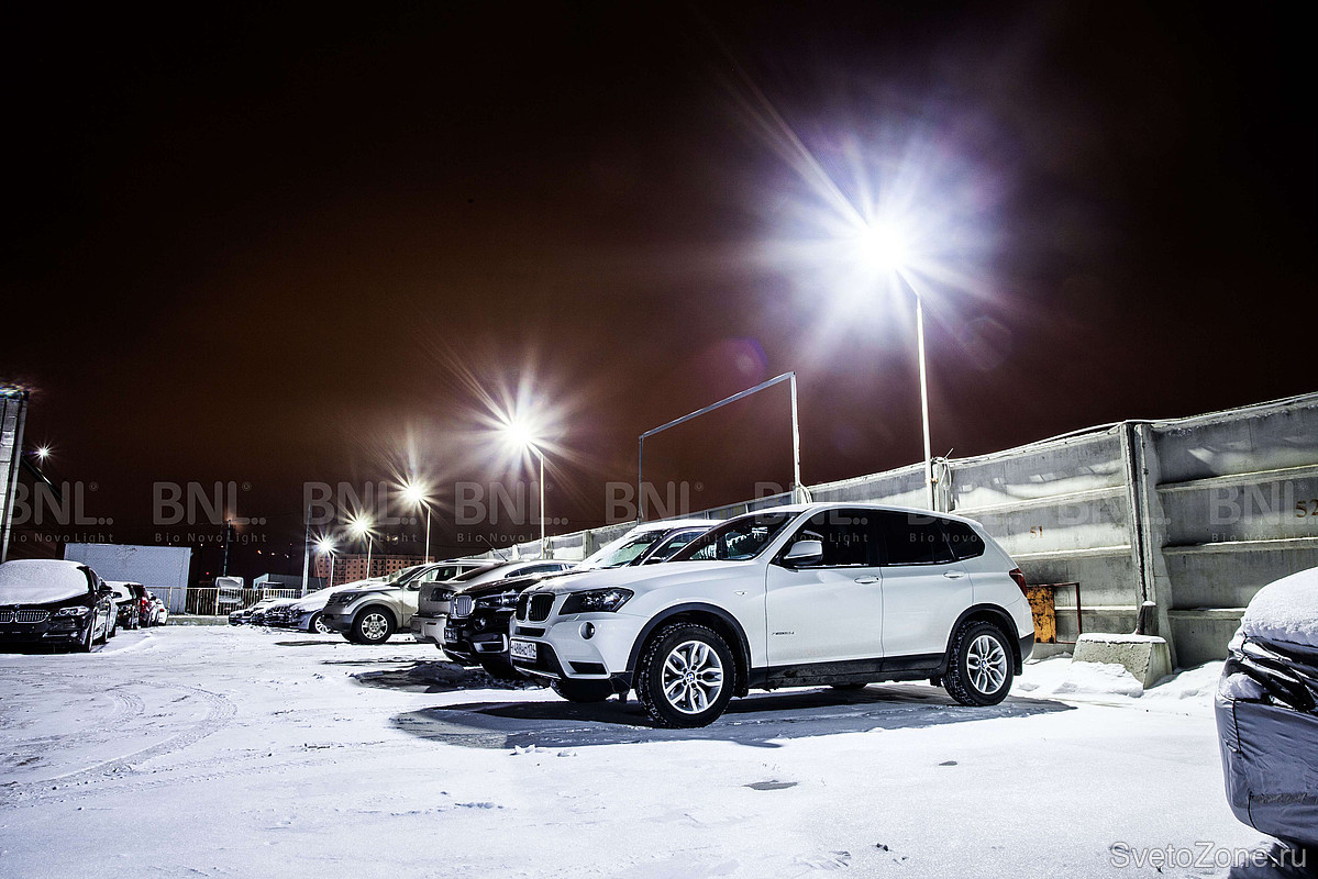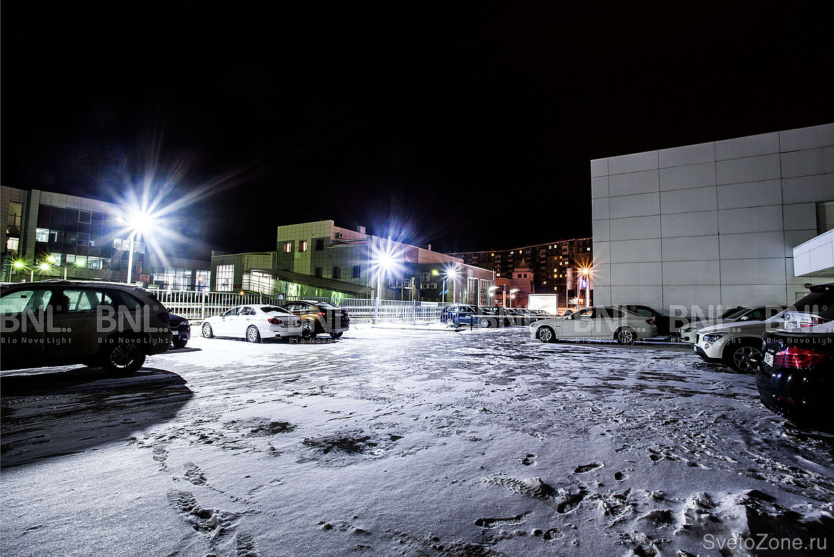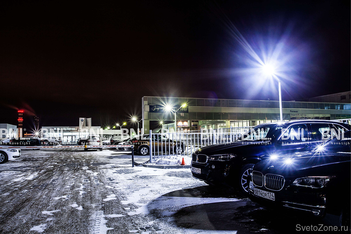 Компания «Ново-Свет» выполнила проект освещения автостоянки официального дилера BMW «М-СЕРВИС» в Челябинске. Для освещения объекта использовались светильники BNL 41-110W/Д/К. |