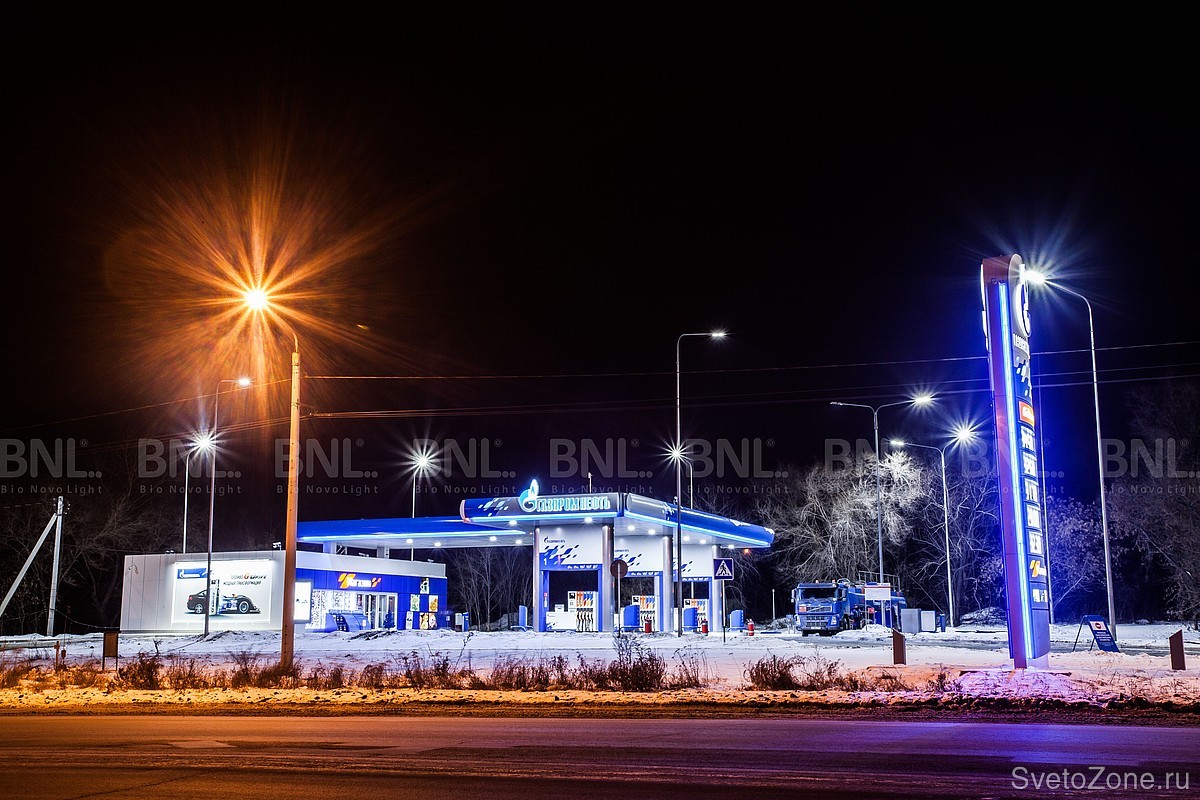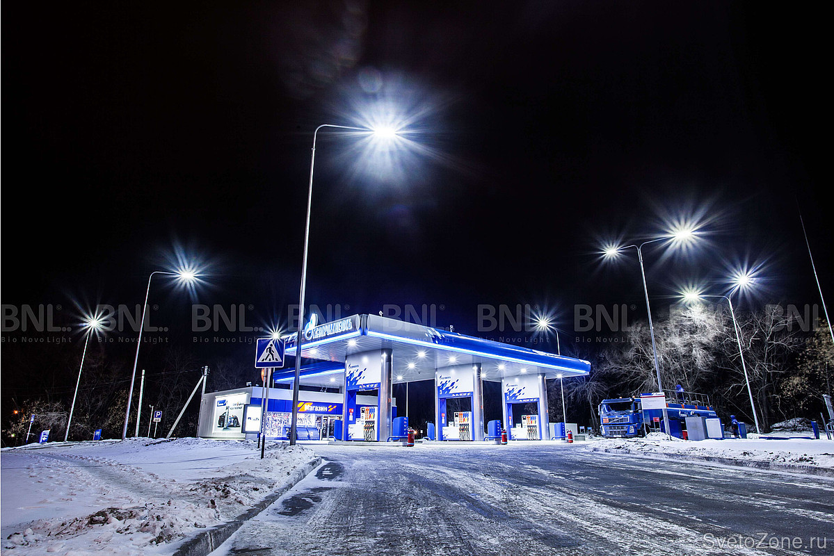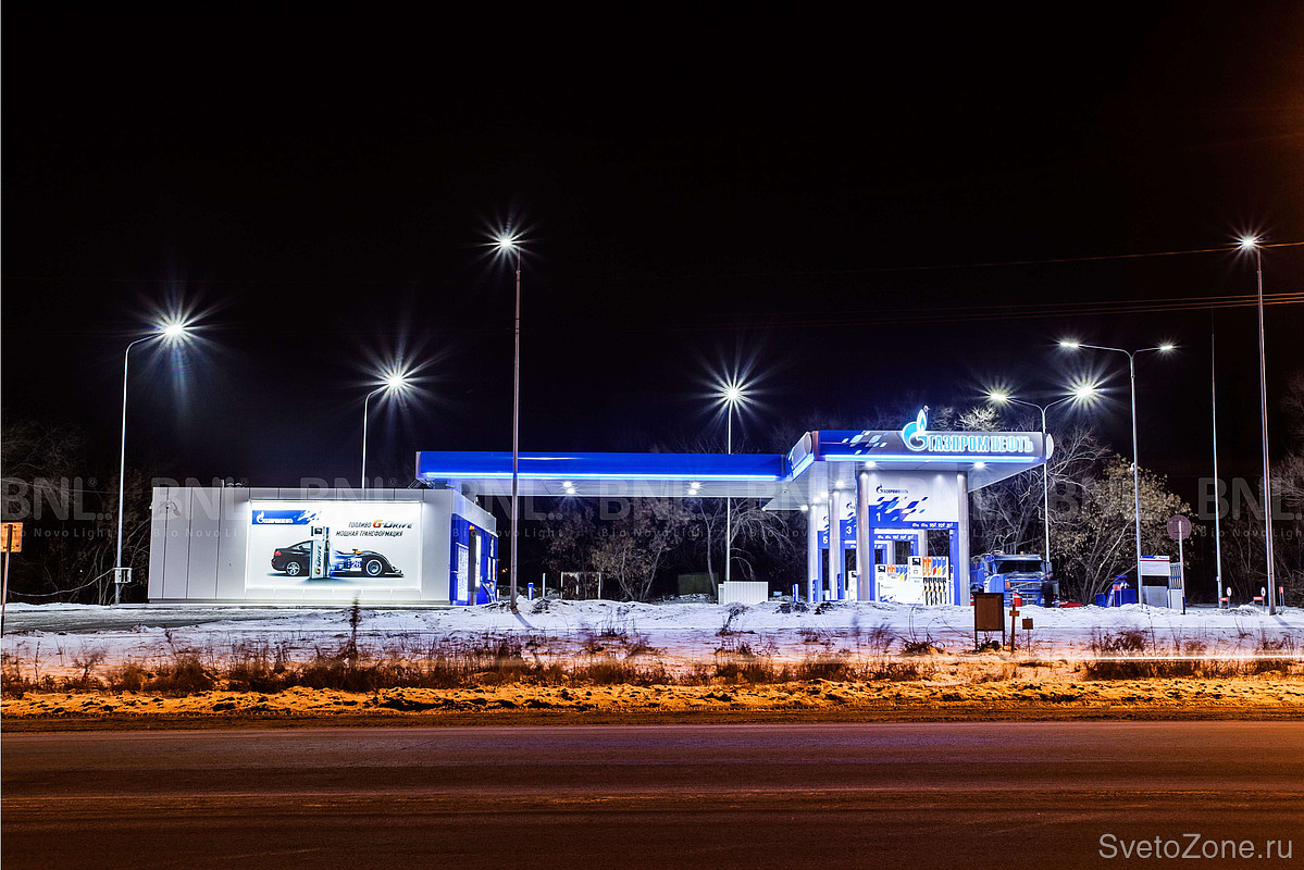 Компания «Ново-Свет» выполнила проект освещения автозаправочной станции № 263 сети АЗС «Газпромнефть - Челябинск». В освещении территории использовалось светодиодные светильники BNL 70-140W/Ш/К. |