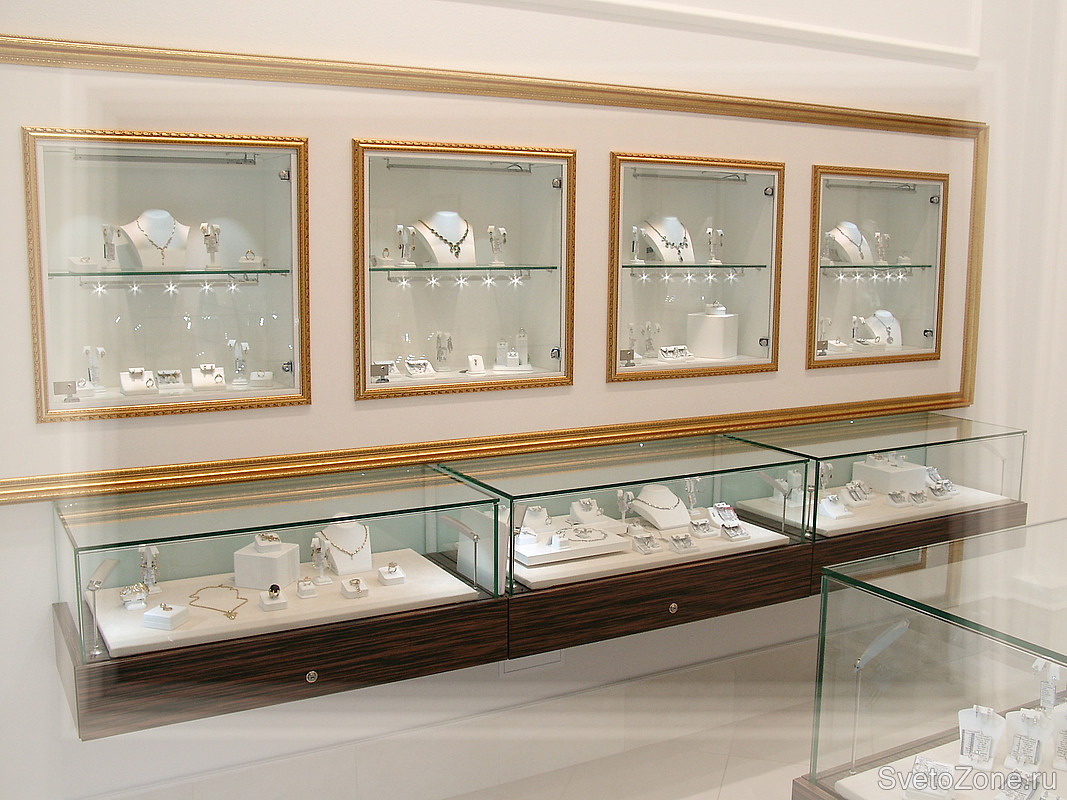 Для освещения ювелирных изделий, размещенных в стенных нишах, были использованы светодиодные линейки с оптикой из ассортимента ArcLed. Они ярко освещают ювелирные изделия, и тем самым дают возможность покупателю рассмотреть индивидуальный образ каждого изделия.