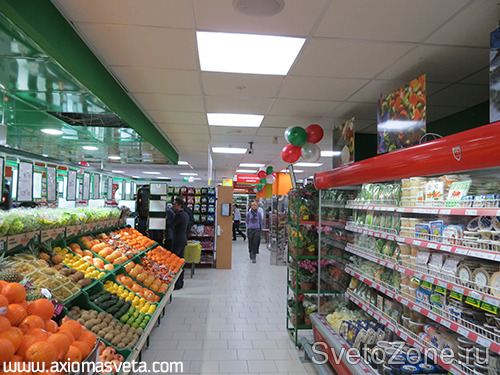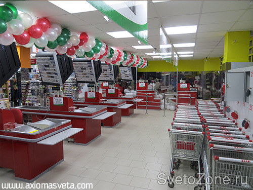 В рамках модернизации систем освещения супермаркетов АТАК, которые входят в состав французской группы АШАН, был осуществлен проект освещения ряда супермаркетов LED светильниками. Были установлены потолочные встраиваемые светильники СПВО-32 для потолков типа АРМСТРОНГ.