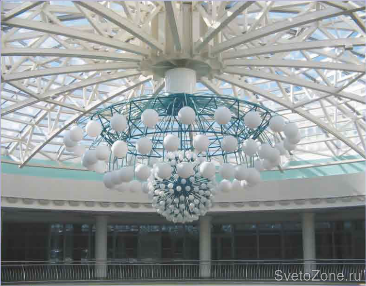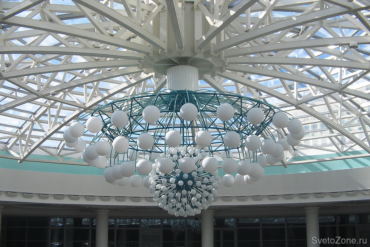 Диаметр светотехнической композиции - 6 м, высота - 4 м, использовано 300 источников света. Плафоны - матовое белое стекло диаметром 300 мм.
