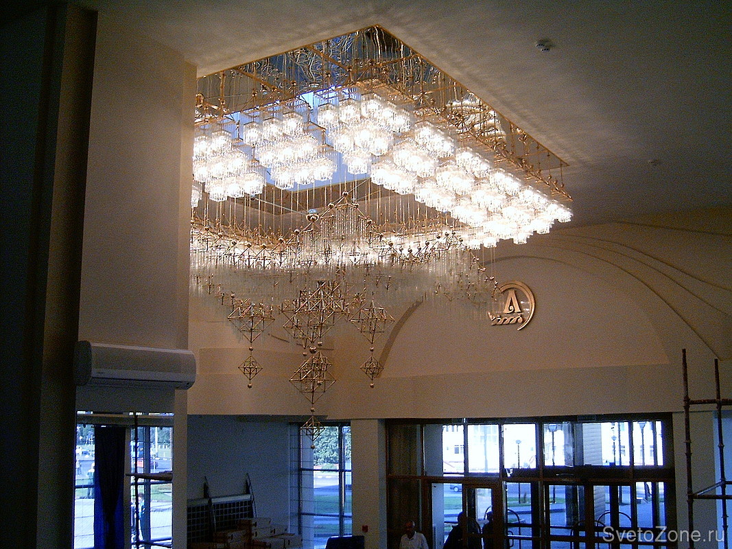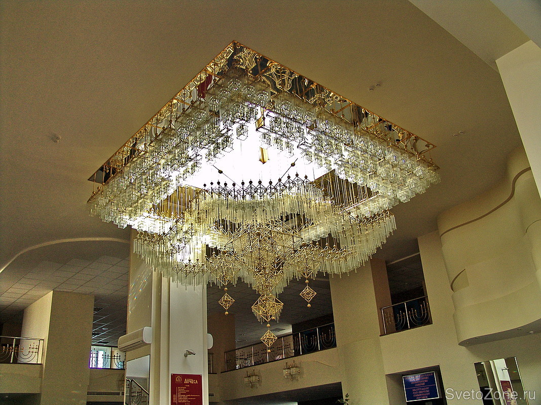 Гостиничный комплекс строился для приема гостей "Славянского базара". В люстре установленной в вестибюле использованы декоративные элементы художественно-прикладного искусства Белоруси. Габариты изделия - 6х6 м.