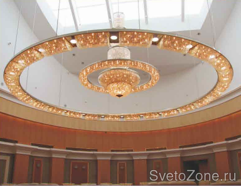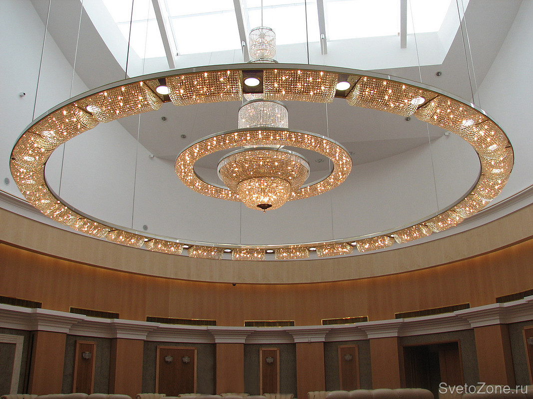 Люстра установлена в зале для проведения международных переговоров. Диаметр - 7200 мм, высота - 3500 мм.