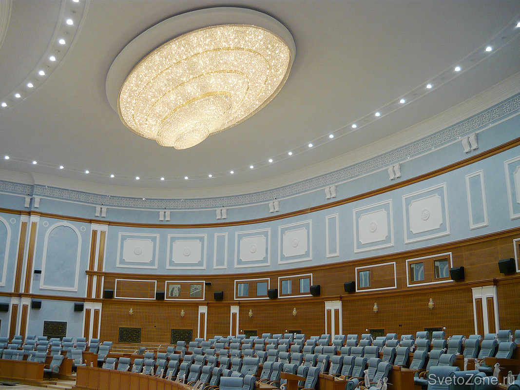 Крупногабаритные люстры для залов официальных церемоний. В медиа-центре установлена уникальная овальная люстра с длиной по найбольшей оси 9 м. Аналогов в мире не существует.