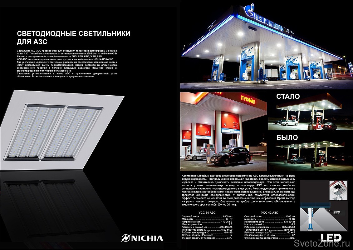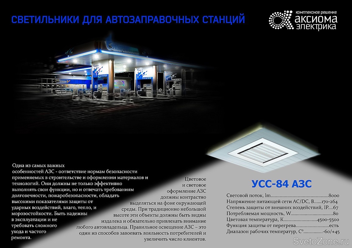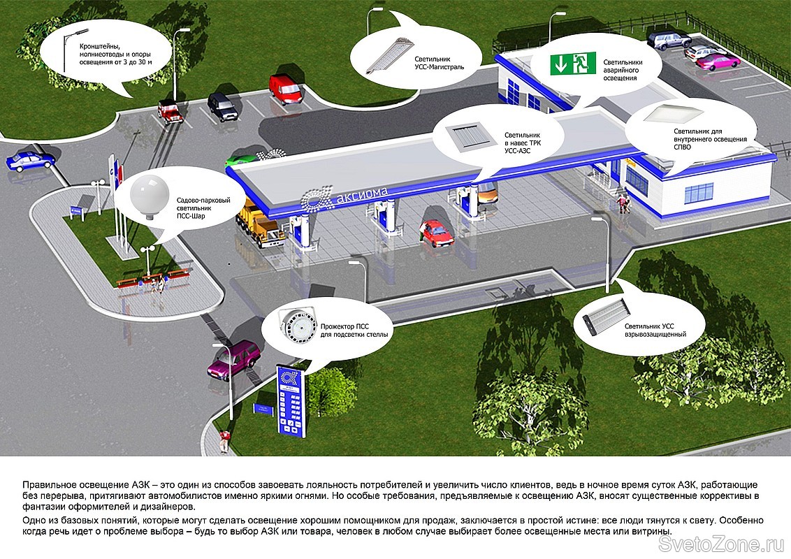 Автозаправочная станция - сложный технологический комплекс, включающий в себя такие подсистемы как: подача топлива, расчётное обслуживание, торговые услуги. Особенность АЗС в том, что они не только осуществляют продажу топлива, но и являются "лицом компании", выступая в роли саморекламы. Значительную роль в успешной организации работы АЗС занимает освещение.