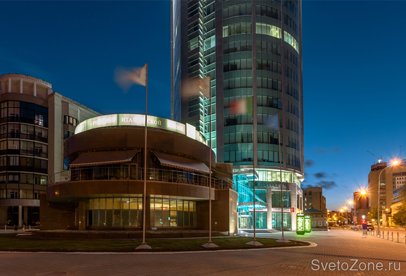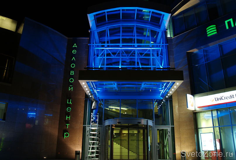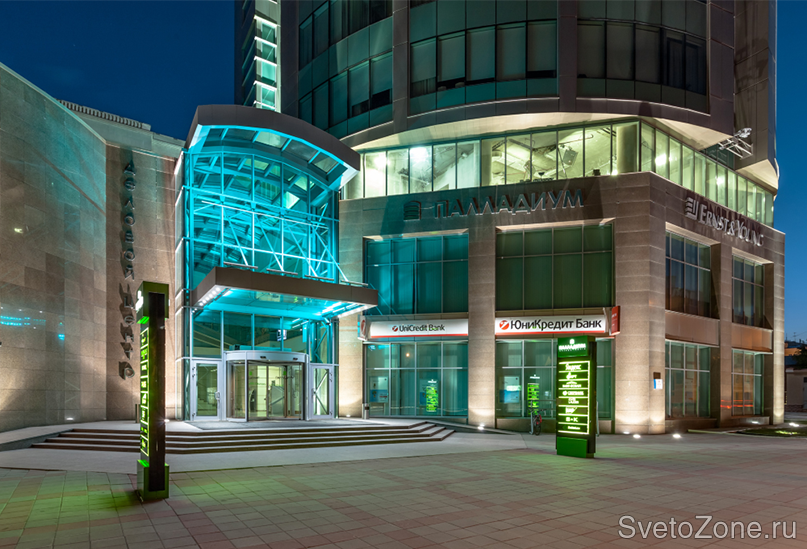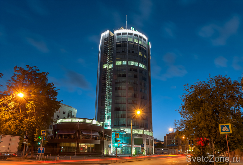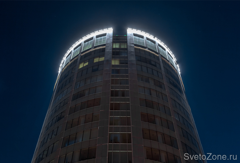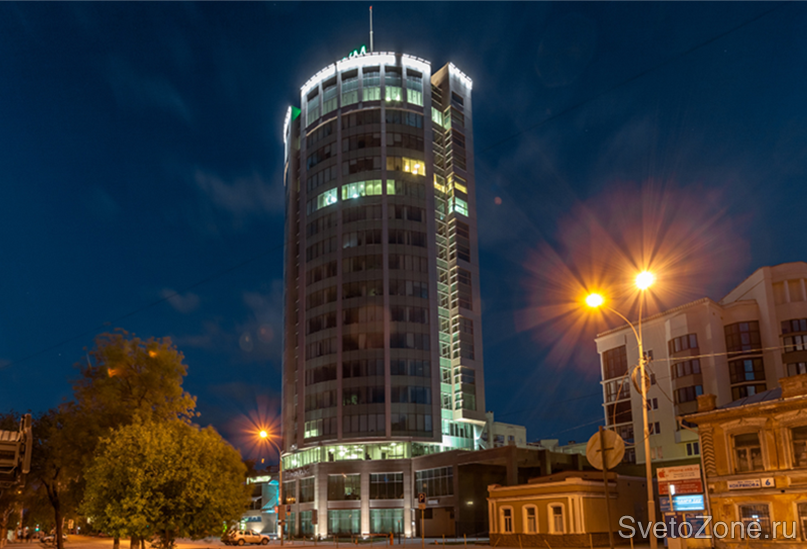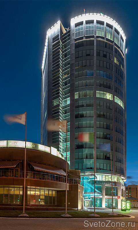 Основой концепции архитектурного освещения делового комплекса послужило местоположение здания и его архитектурный образ. Форма сооружения диктует применение оптимальных в данном контексте светоцветовых решений. Периметры верхних ярусов здания обозначены с помощью линейных светодиодных светильников серии IntiLINE. В качестве источников света в приборах используются светодиоды с цветовой температурой 4000 К (холодный белый свет).